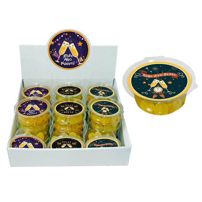 Mini bakje met gommetjes die je kunt vervangen voor de druiven op oudejaarsavond.