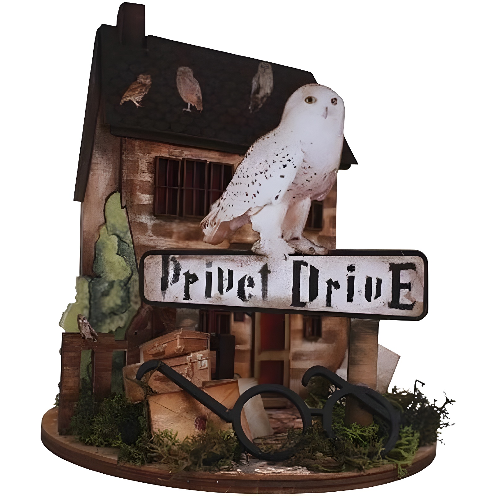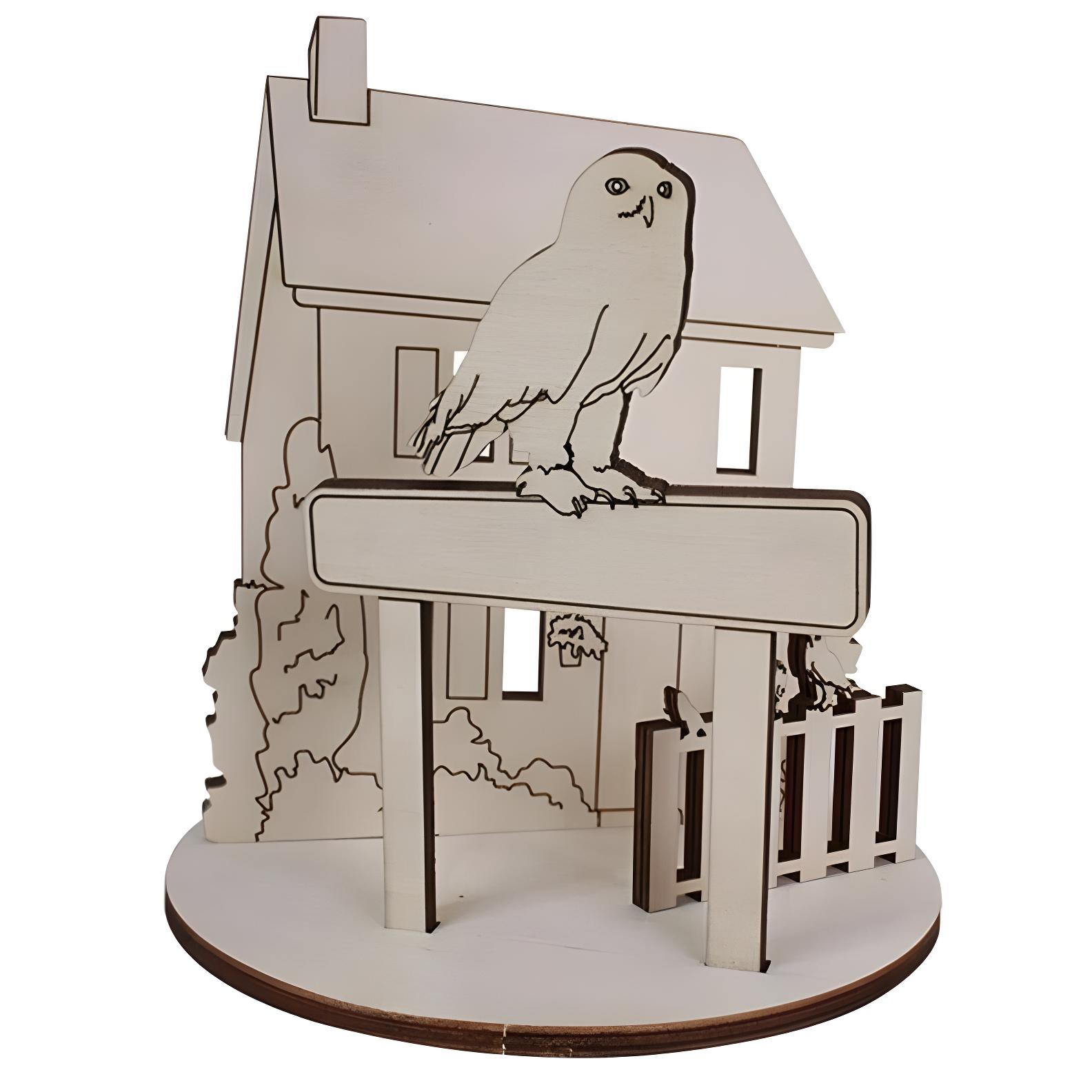 - Decoratieve scène met huis, bord en uil uit de Magieschool-collectie.