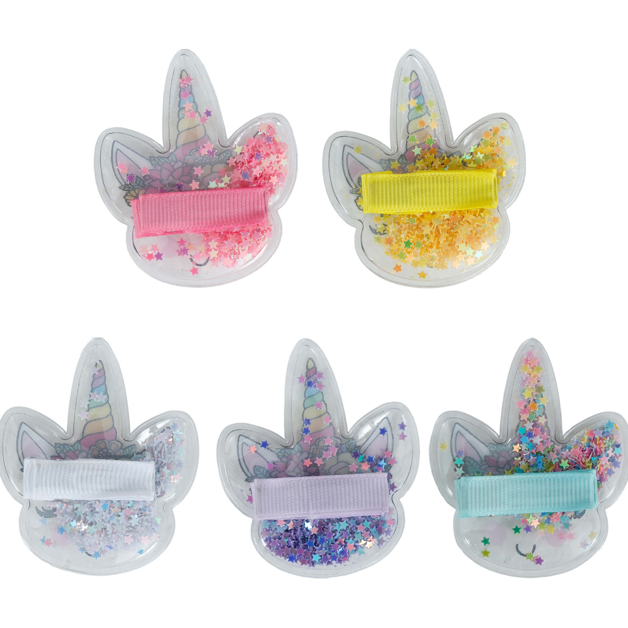Set van 12 haarklemmetjes met vrolijke eenhoornontwerpen, perfect voor meisjes en als extraatje op kinderfeestjes. Elk klemmetje heeft een glanzende afwerking met schud-glitter die alle aandacht trekt.