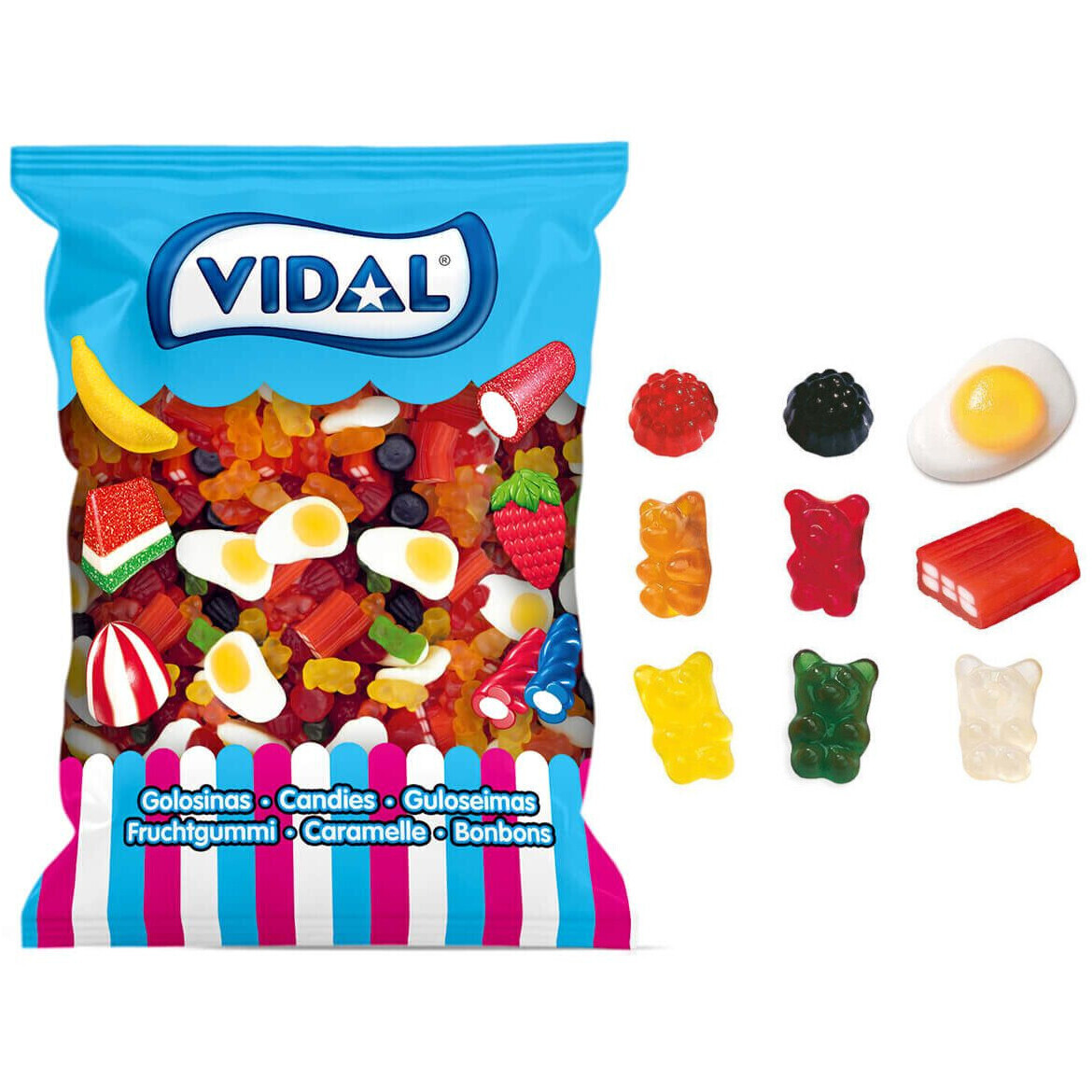 Ingrediënten: glucosestroop, suiker, maïszetmeel, glucose-fructosestroop, gelatine, invertsuikerstroop, tarwebloem (bevat gluten), dextrose, zuurteregelaar: citroenzuur, appelzuur; 1% sap (druif, peer, ananas, perzik) uit concentraat, palmvet, bevochtigingsmiddel: glycerine; aroma's, aardappelzetmeel, geleermiddel: pectinen; glansmiddel: carnaubawas, bijenwas; zuurteregelaar: kaliumcitraten; plantaardige oliën (kokosnoot, palm), plantaardig concentraat: citroen, saffloer, radijs, wortel, zwarte bes; zout, kleurstoffen: E120, E102, E153, E133, E129.