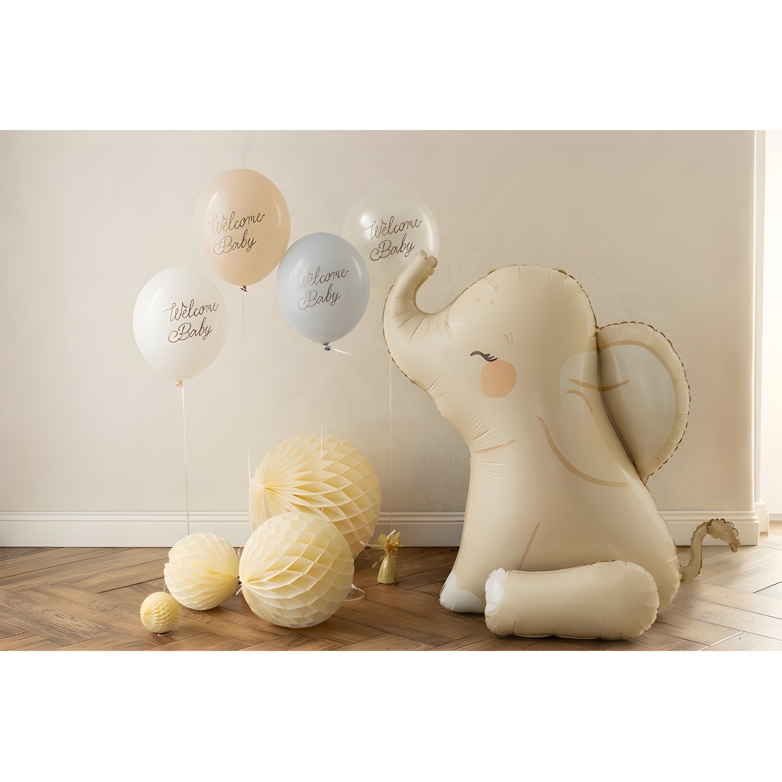 Beige olifant-folieballon met een lief, expressief uiterlijk - perfect als aanvulling op de decoratie bij geboortevieringen.