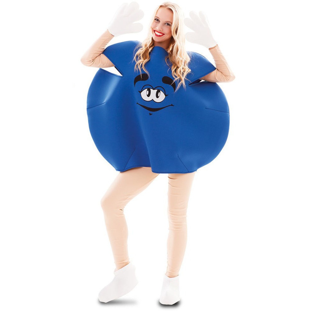 Het kostuum bestaat uit één stuk in blauw, met aan de voorkant een opdruk van een glimlachend gezicht.