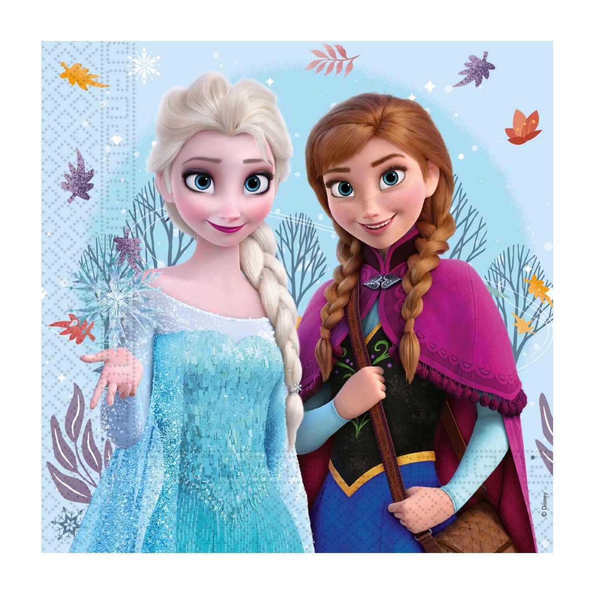Set servetten met Frozen-design in blauwtinten, met Elsa en Anna. Ideaal om kinderfeestjes een magische en speelse sfeer te geven. De servetten zijn dubbelgelaagd voor extra zachtheid en stevigheid, met een ontwerp speciaal voor fans van de filmreeks.