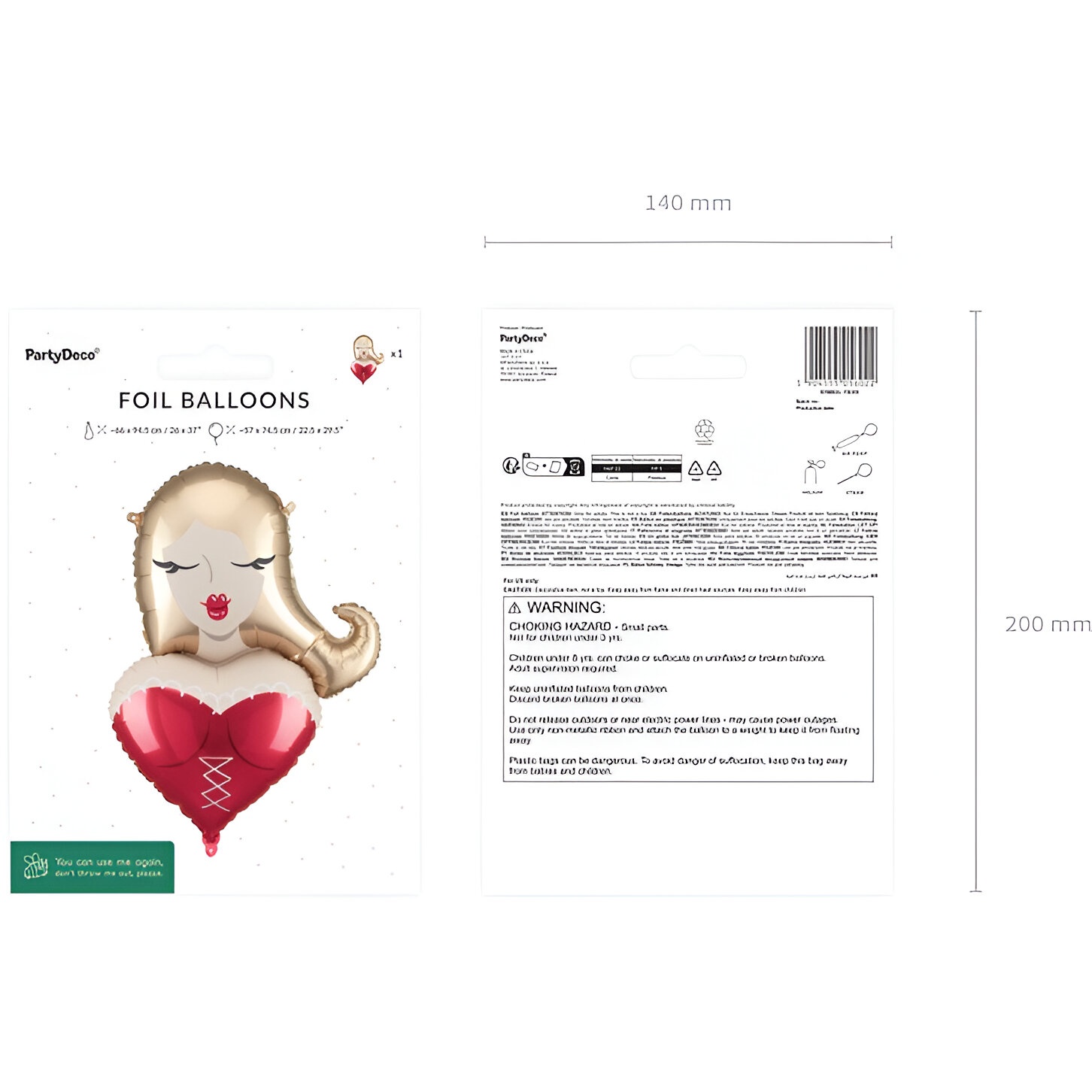 Decoratieve ballon met een vrouwelijk ontwerp: een blonde vrouwenfiguur op een groot rood hart met gouden details en opvallende lippen. Ideaal voor vrijgezellenfeesten en feestelijke gelegenheden waar je een elegante, speelse touch wilt. Afmetingen ca. 66 x 94,5 cm vóór opblazen en ca. 57 x 74,5 cm na opblazen. Kan met lucht of helium worden gevuld om aan te sluiten bij de door jou gewenste decoratie.