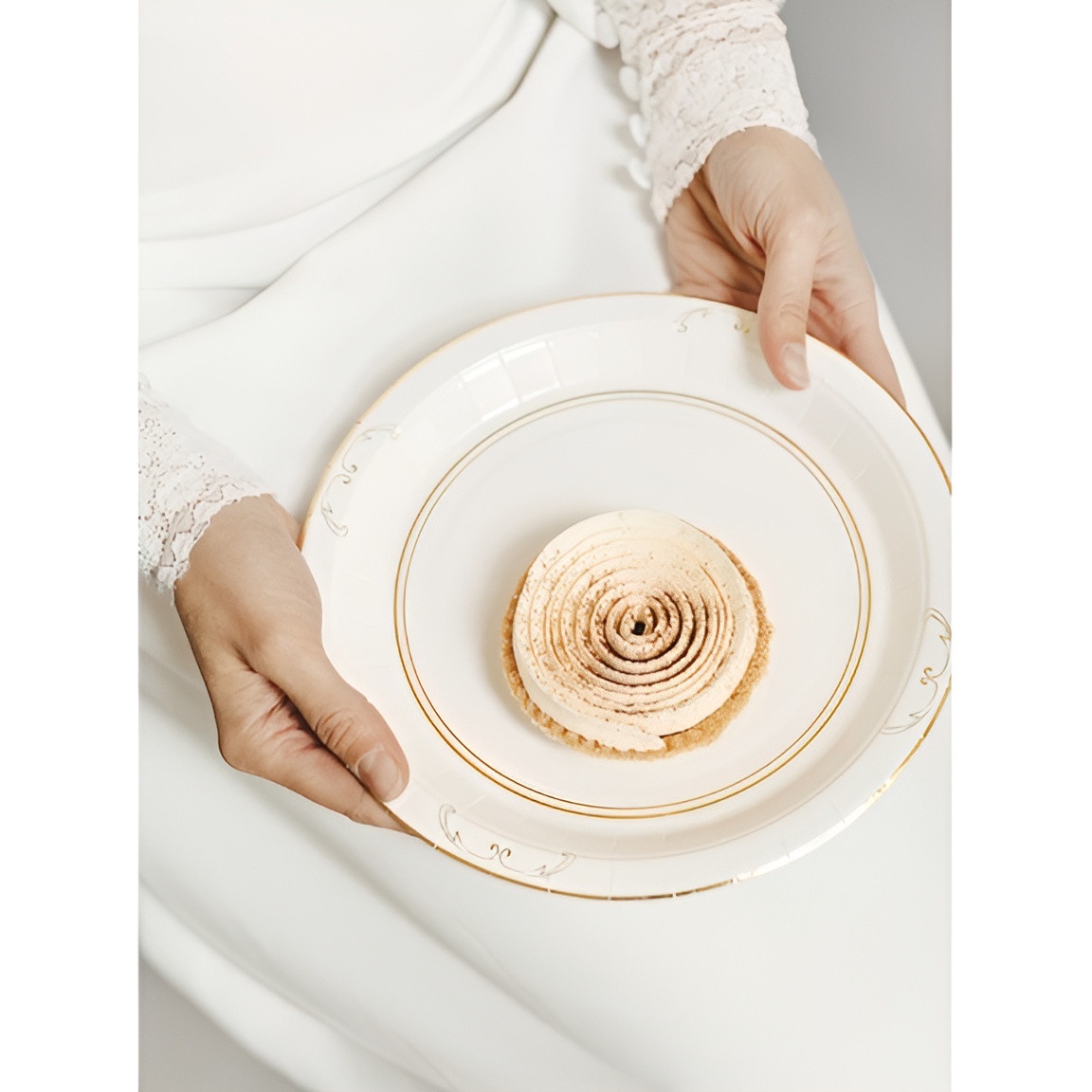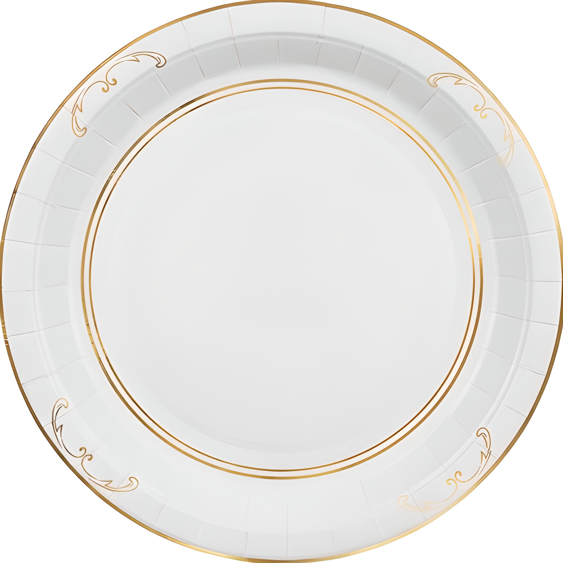 Witte, ronde borden met een subtiel gouden ornament dat elke tafel een verfijnde uitstraling geeft. Ongeveer Ø 23 cm, ontworpen voor stijlvolle vieringen en evenementen. Klassiek en neutraal ontwerp dat gemakkelijk combineert met verschillende decoraties en kleurenpaletten. Ideaal voor bruiloften, banketten en recepties waar men een elegante afwerking wil zonder poespas.