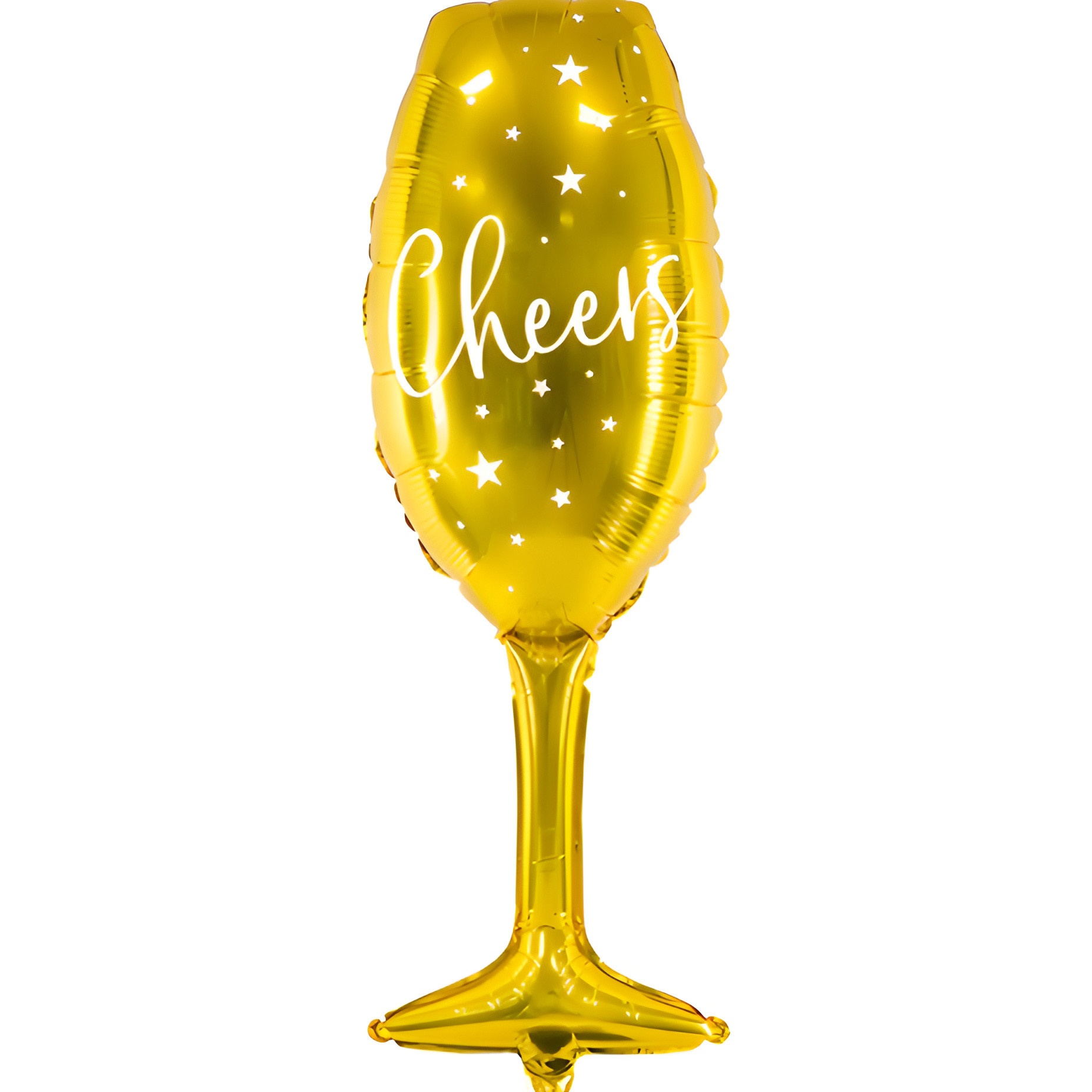 Gemaakt van foliepapier, deze XL ballon kenmerkt zich door zijn gouden glasvorm, met het opschrift 'Cheers' in het Engels en een achtergrond van witte sterren. Hij kan worden opgeblazen met lucht, maar we raden helium aan, omdat dit hem helpt zijn natuurlijke positie te behouden.