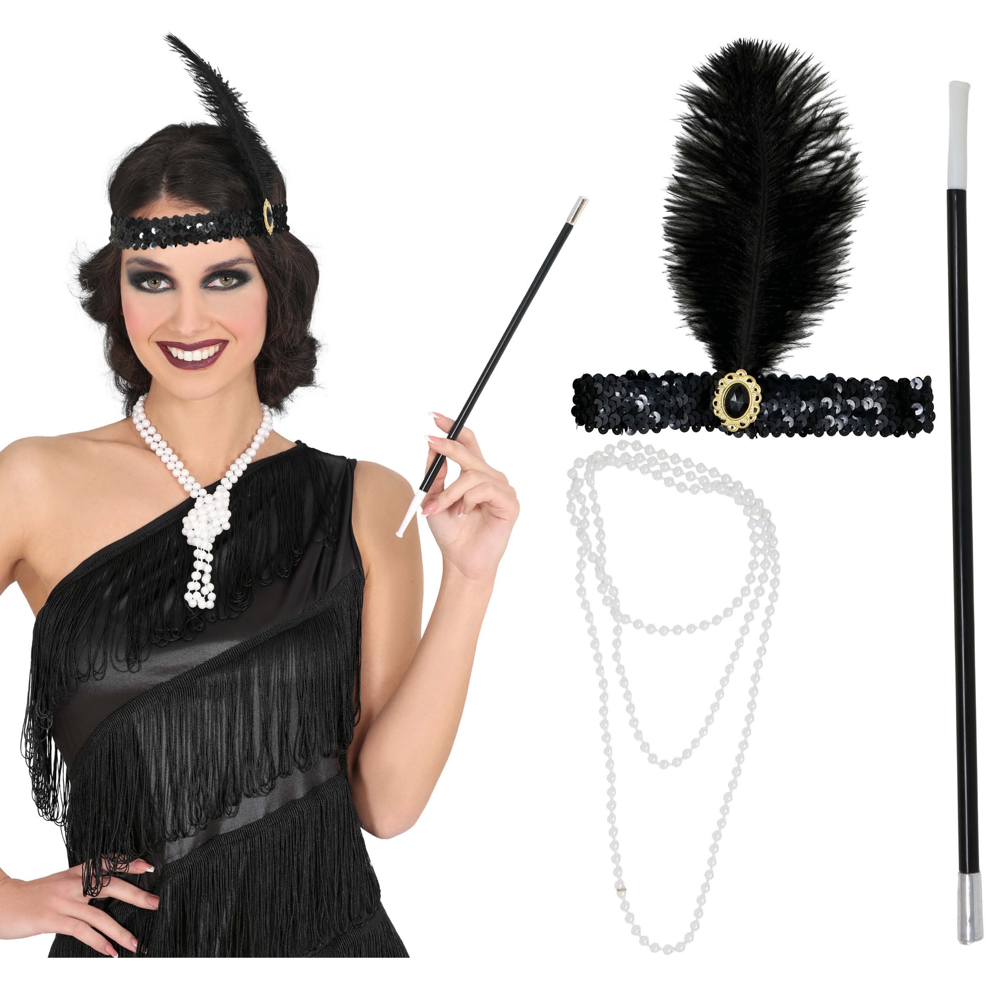 Creëer een authentieke en verfijnde Charleston-look. Deze set geeft je themafeesten, carnaval of vrijgezellenfeest de retro en stijlvolle uitstraling van de jaren 20. Ontworpen om jurken met franjes en vintage-stijlen te complementeren, maakt het elke outfit feestelijk en glamoureus. Perfect voor fotoshoots en evenementen waar je met stijl wilt opvallen.