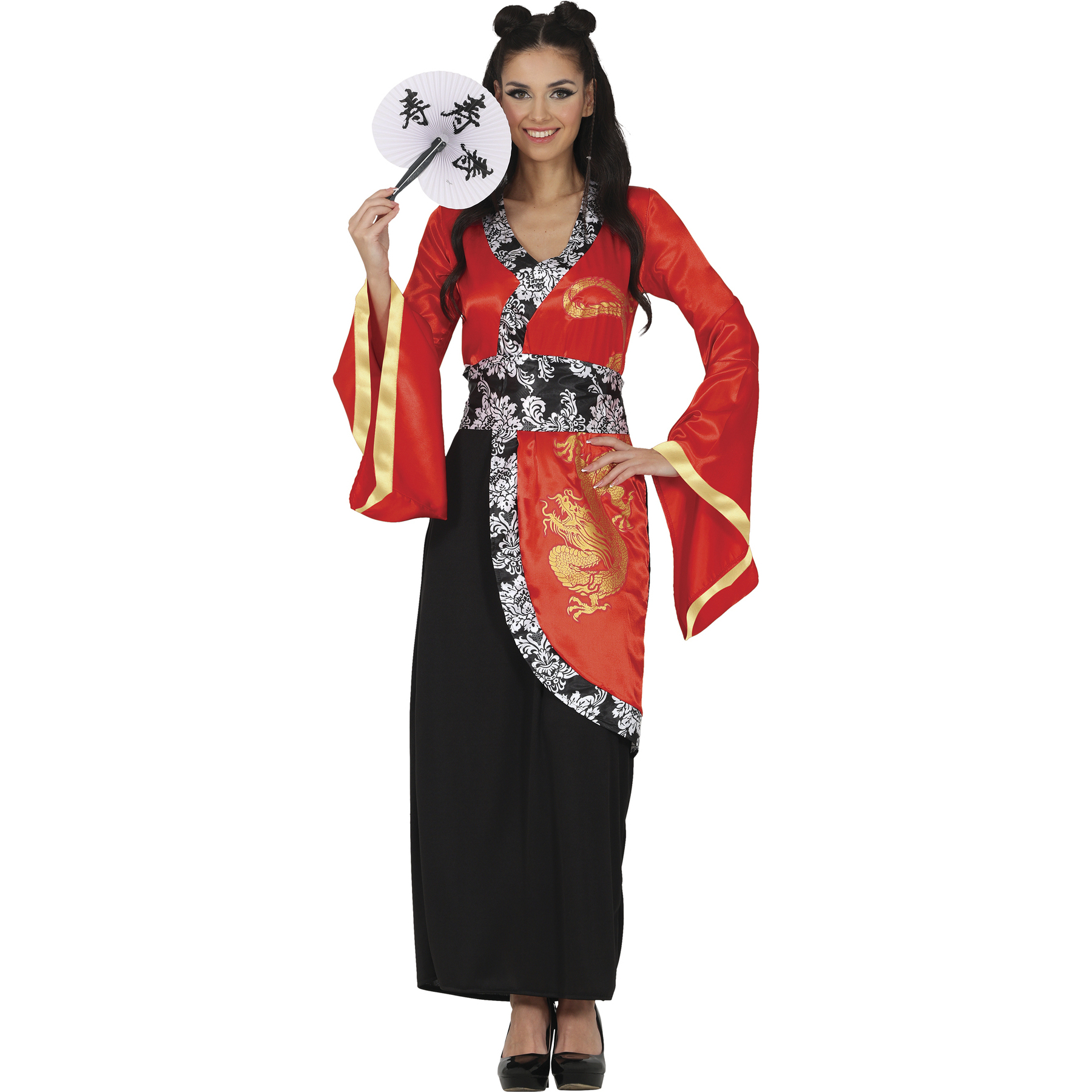 Een klassiek oosters model voor vrouwen bestaande uit een jurk in rood en zwart met gouden details, compleet met een riem.