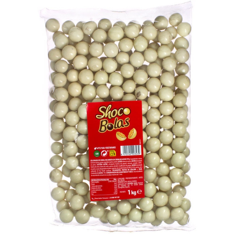 - Witte chocoladeballen: Graan dragee bedekt met melkroom (75%). Melkgehalte: 14%.