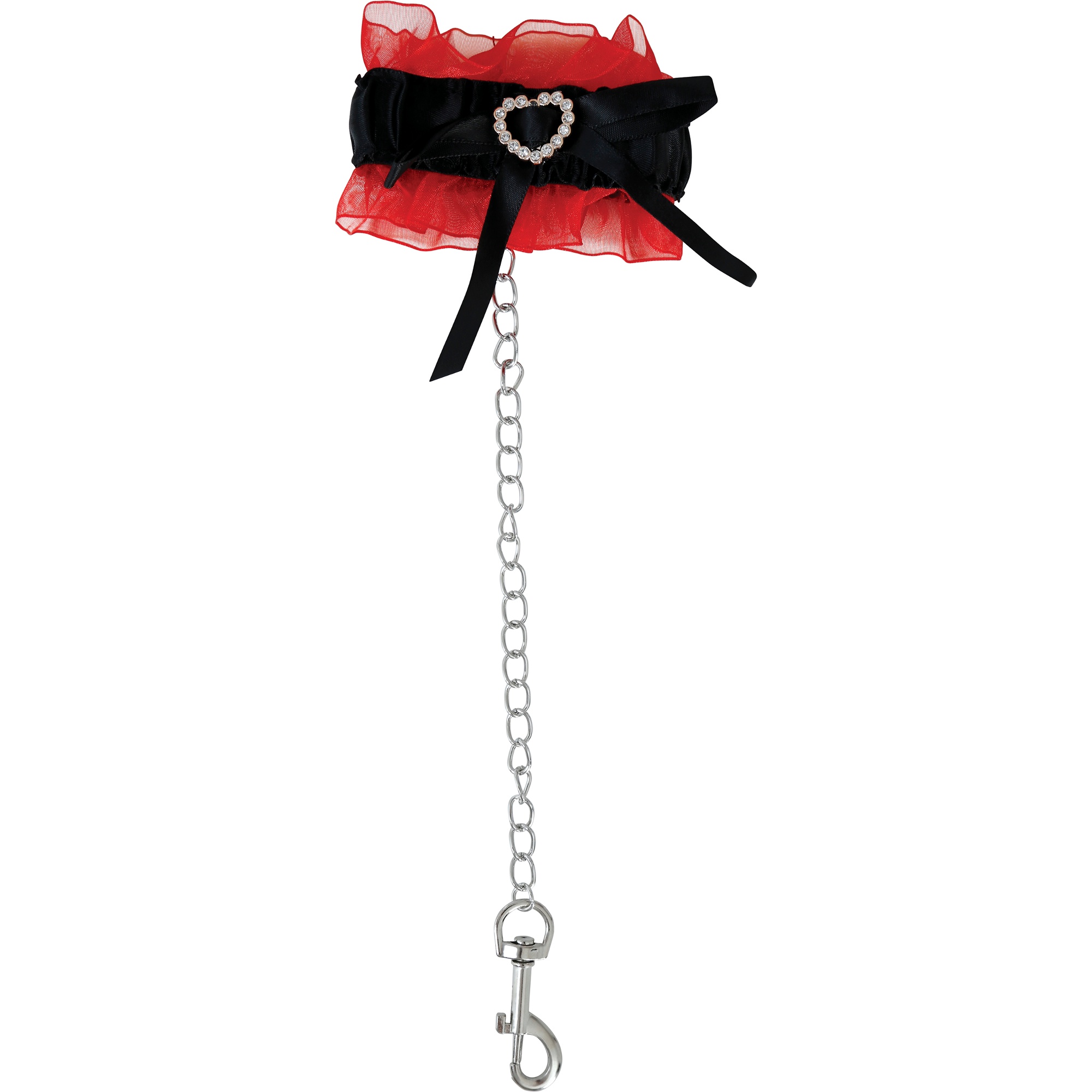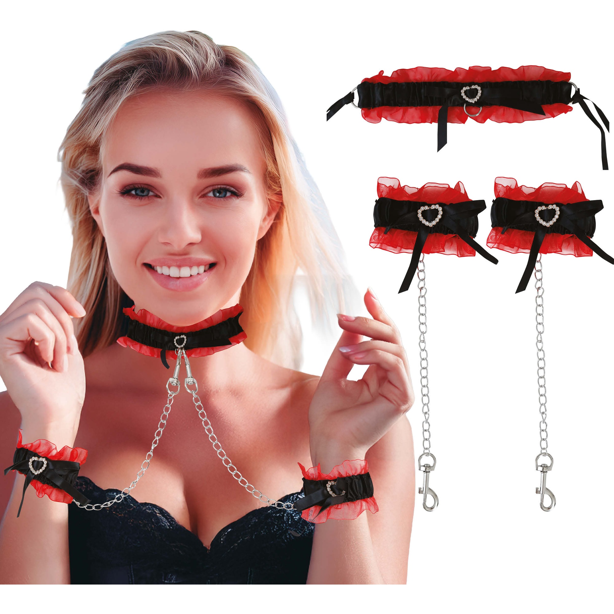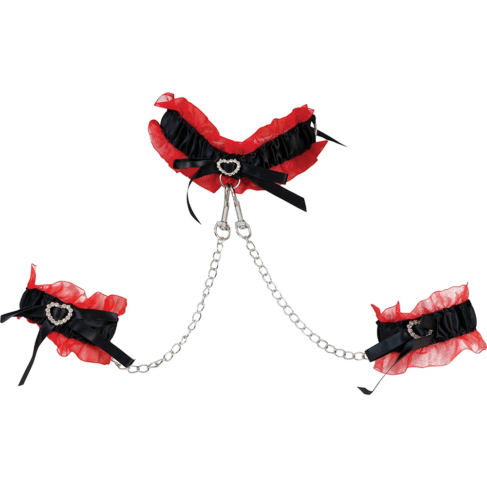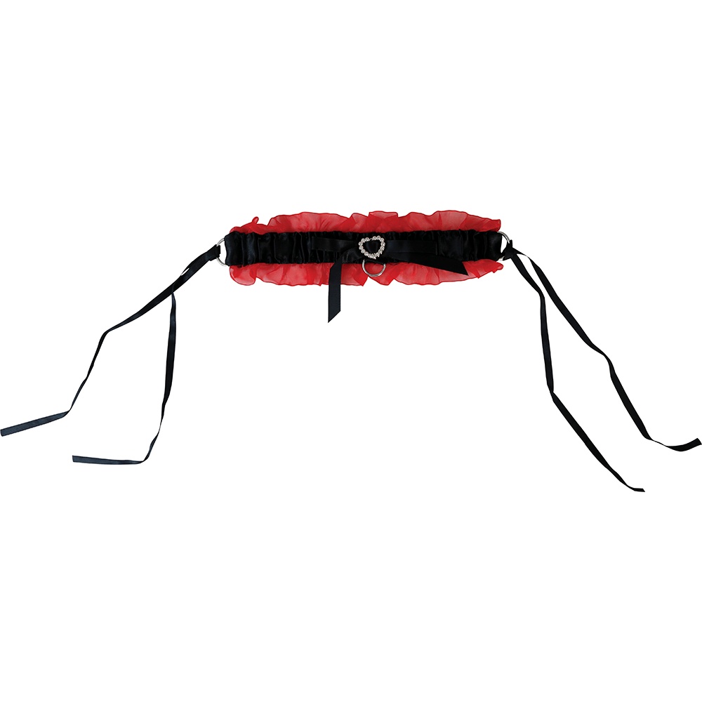 Sensueel burlesque-setje dat ontworpen is om elke verleidelijke look te versterken. De combinatie van rode ruches, zwarte linten en metalen details zorgt voor een elegant en opvallend contrast. De kettingen geven een dramatisch accent en zijn naar wens te verwijderen. Verstelbaar en comfortabel - ideaal voor fotosessies, shows of speciale avonden waarop je wilt opvallen.