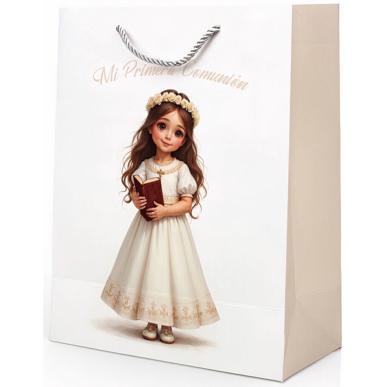 - Cadeautas voor de communie met afbeelding van een meisje met bijbel.