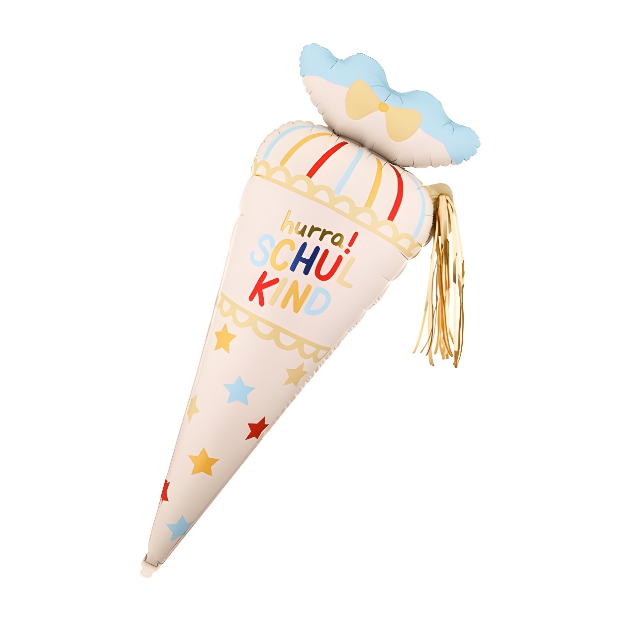 Crèmekleurige folieballon in conische vorm met de tekst "Hurra Schulkind", versierd met sterren en pastel- en goudaccenten. Afmetingen: 43 x 113 cm vóór het opblazen (16,9 x 44,5'') en 34,5 x 99 cm na het opblazen (13,6 x 39''). Zelfsluitend voor snel en comfortabel opblazen. Geschikt voor helium en voor lucht; voorzien van geïntegreerde haakjes en een decoratieve kwast om in decoraties te verwerken of aan de muur te hangen. De set bevat een opblaasrietje.