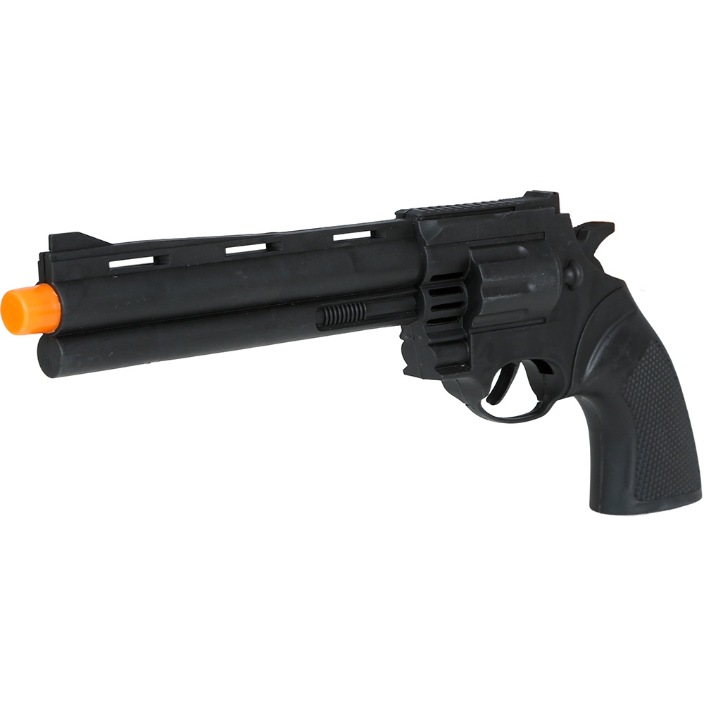 Speelgoedrevolver in westernstijl, ontworpen als aanvulling op Wilde Westen?kostuums. Voorzien van een oranje veiligheidspunt en vervaardigd uit lichtgewicht PVC, zodat het duidelijk als speelgoed herkenbaar is. Ideaal voor themafeesten, Carnaval en fotosessies met western?sfeer. Het realistische uiterlijk geeft je outfit extra effect zonder risico.