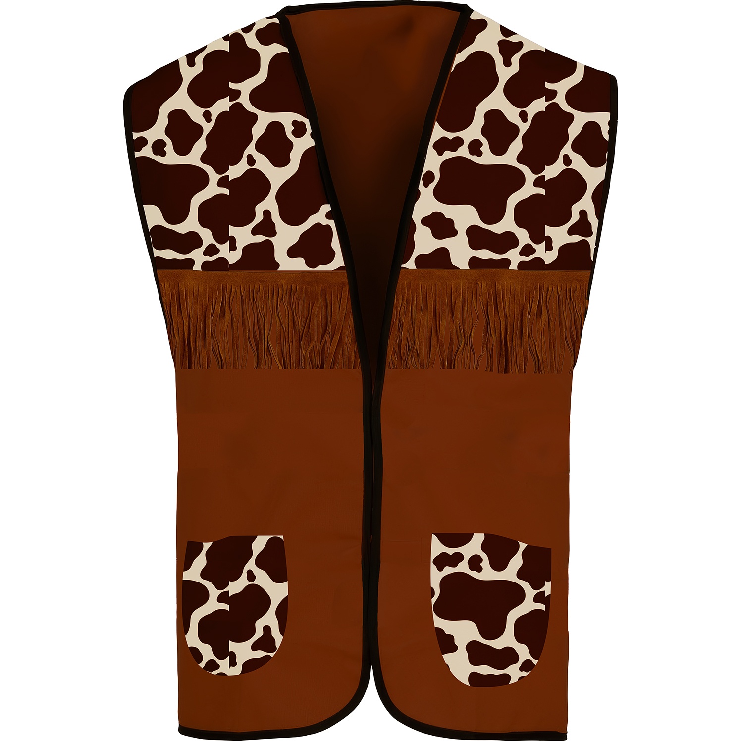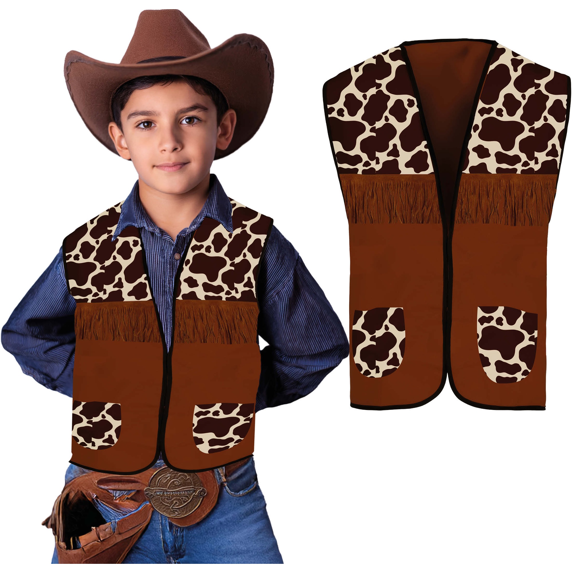 Kinder-cowboyvest met koeienprint en decoratieve franjes, dat een speels en authentiek accent geeft aan de cowboylook.
