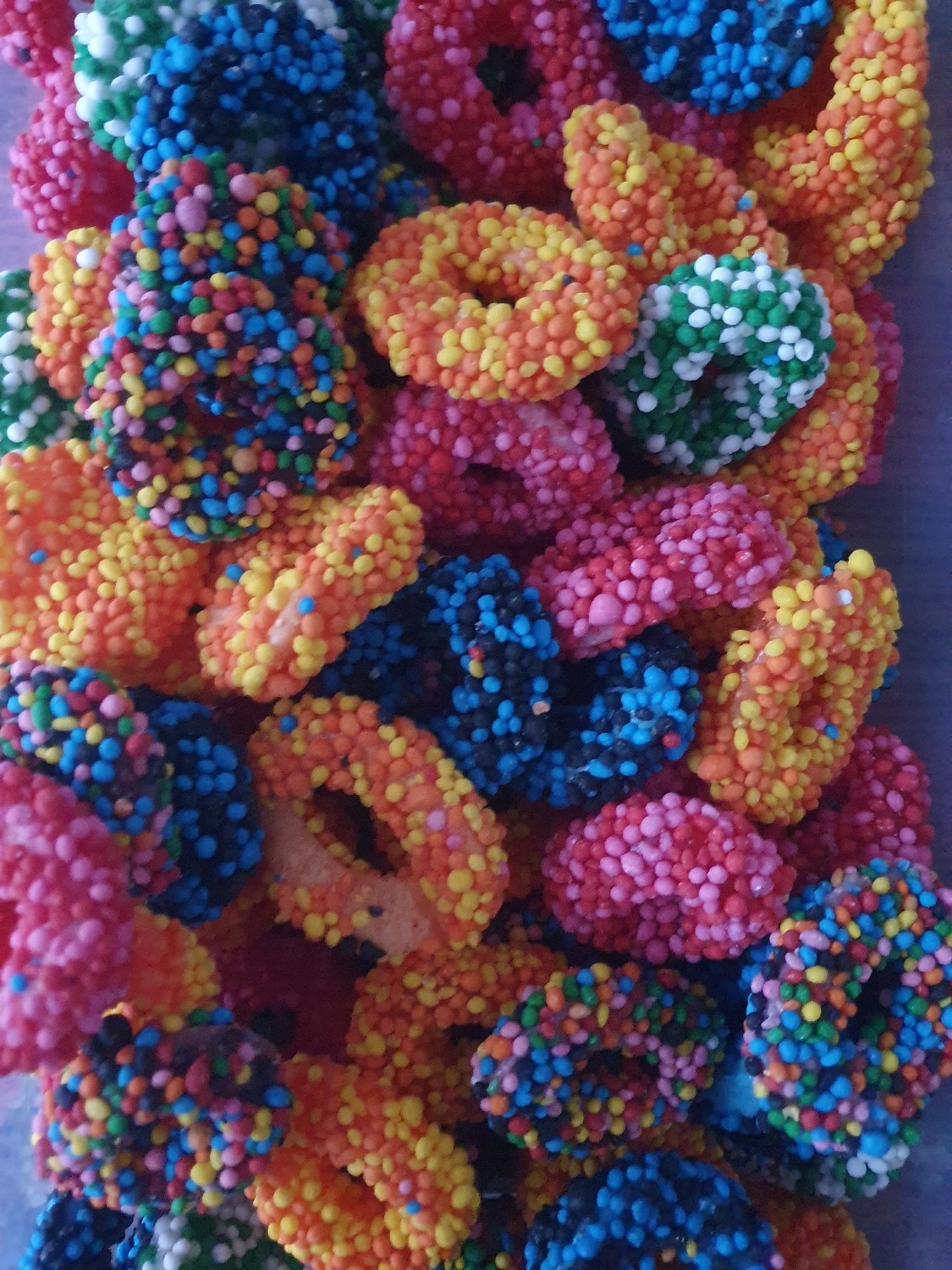 Ingrediënten: suiker, glucosestroop, water, rijstmeel, halal rundergelatine, zuurteregelaars: E296, E330, stabilisatoren: E350ii, coatingmiddel: E414, aroma's, kleurstoffen: E102, E122, E129, E133, E158. E102, E122 en E129 kunnen een negatief effect hebben op de activiteit en de aandacht van kinderen.