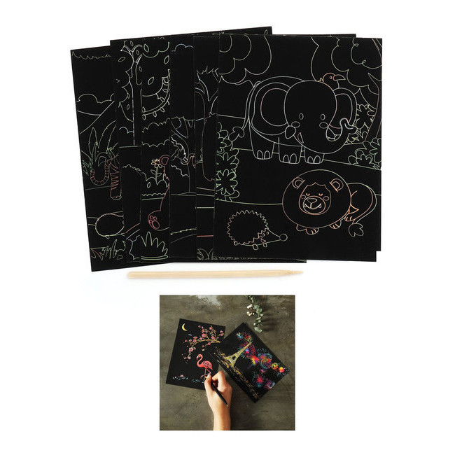 Pak van 6 creatieve krasvellen die aan de voorkant gekrast kunnen worden en aan de achterkant naar eigen wens ingekleurd kunnen worden met een dierenthema.