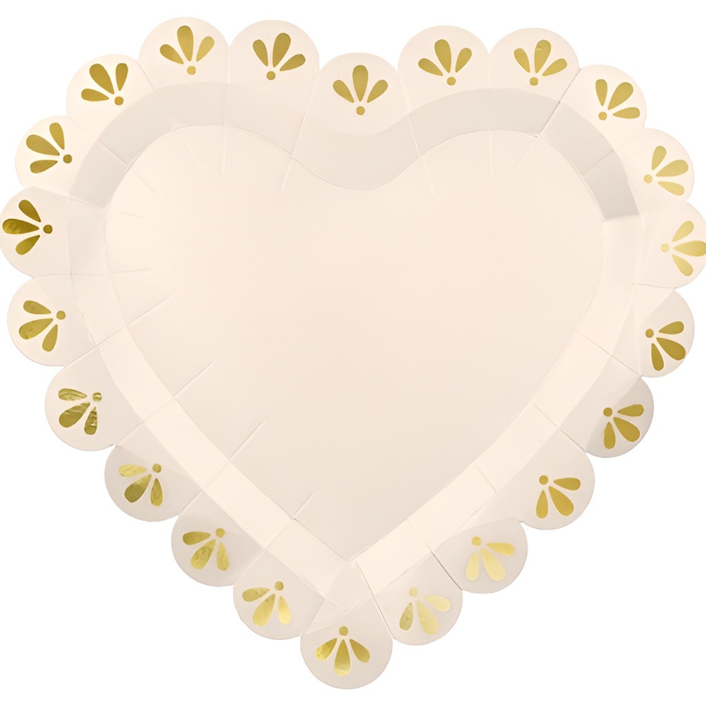 Papieren borden in hartvorm in een crèmekleur met gouden details die een romantische en verfijnde toets geven. De elegante afwerking versterkt de presentatie van tafels bij bruiloften en formele gelegenheden. Het formaat is geschikt voor voorgerechten, desserts en kleine hapjes, en behoudt een verzorgde uitstraling. Een wegwerpproduct ontworpen om het opbouwen van evenementen te vergemakkelijken zonder in te leveren op stijl.