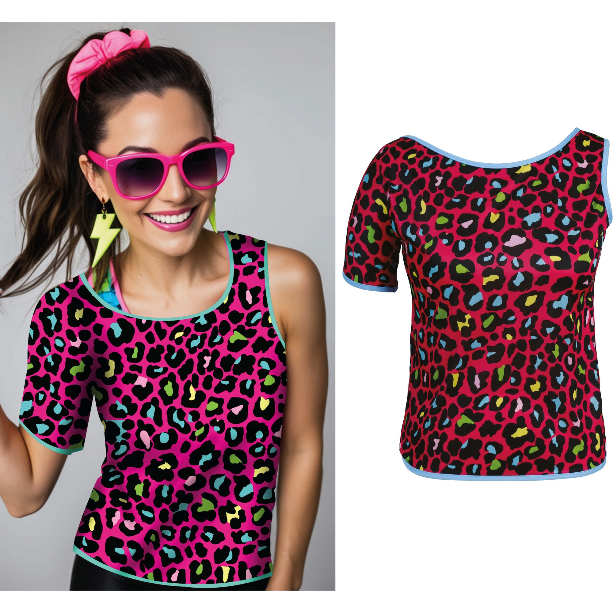 - Levendige neon luipaardprint geïnspireerd op de jaren 80.