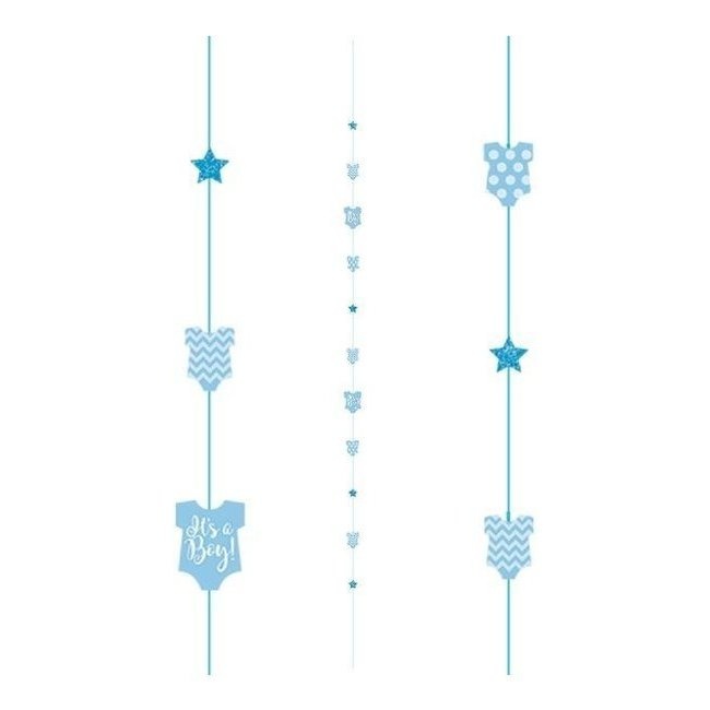 Kant-en-klare decoratie om je ballonnen aan te binden voor je baby shower. Het bestaat uit een visdraad versierd met verschillende papieren figuren in de vorm van babykleding en sterren.