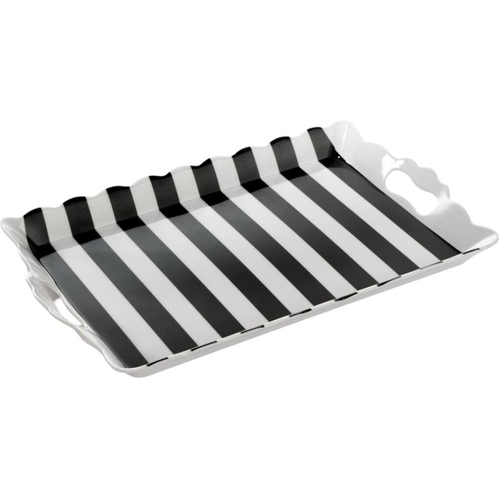 Dienblad met een klassiek zwart-wit streepjespatroon dat elke tafel een moderne en verfijnde look geeft. Het compacte formaat en de geïntegreerde handgrepen maken het praktisch om hapjes te presenteren en sfeer op evenementen te creëren. Perfect te combineren met contrasterend servies voor een stijlvolle presentatie.