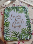 Dit product bevat 2 kartonnen dienbladen met een rechthoekig ontwerp en een opdruk van tropische bladeren op een witte achtergrond, vergezeld van de tekst ‘Enjoy the little things’ in gouden kleur en kalligrafische stijl.