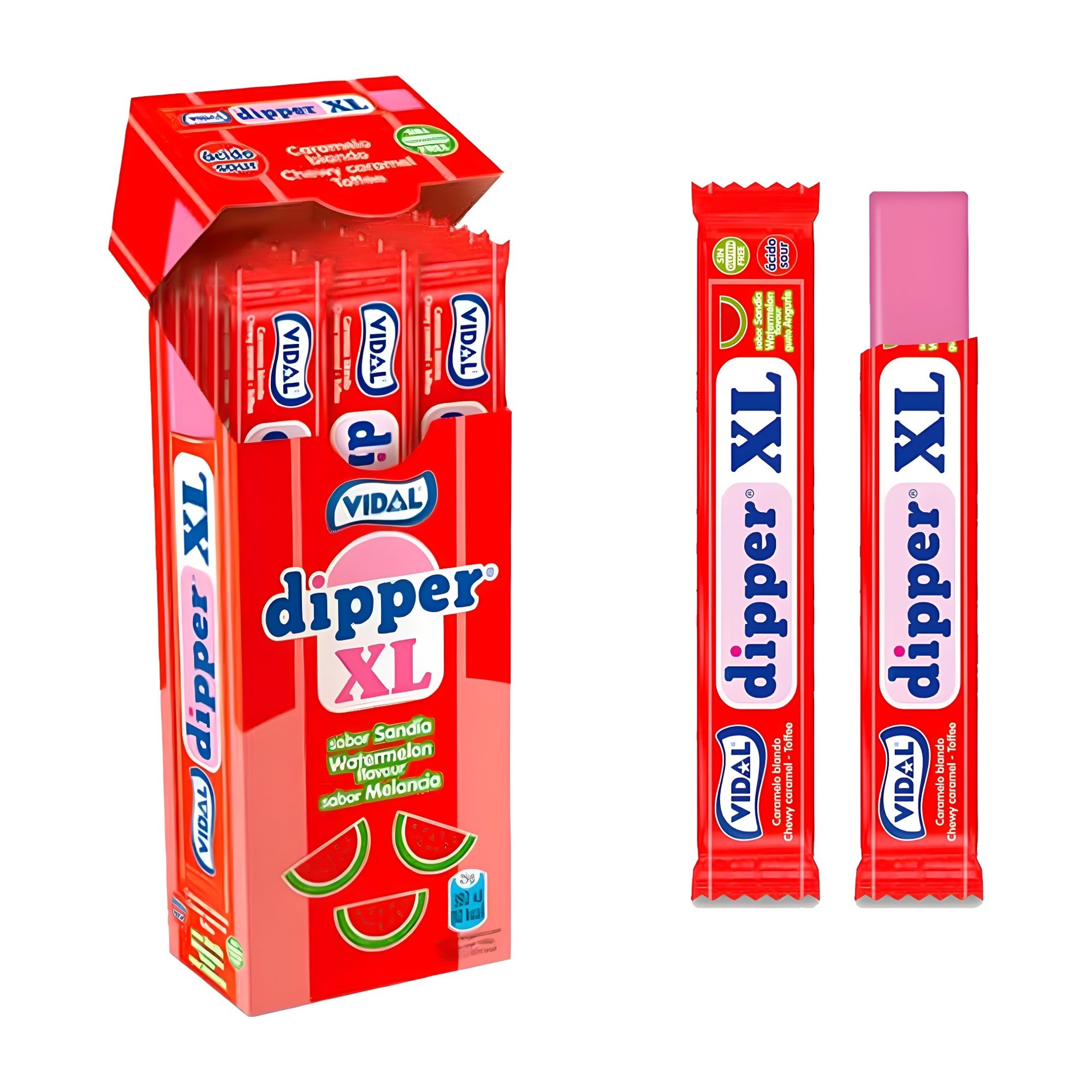 Leuk en heerlijk zacht snoep in XL?formaat met echte watermeloensmaak. De originele Dipper XL van Vidal heeft een zachte textuur die in de mond smelt en zorgt voor een sappige, intense smaakbeleving.
