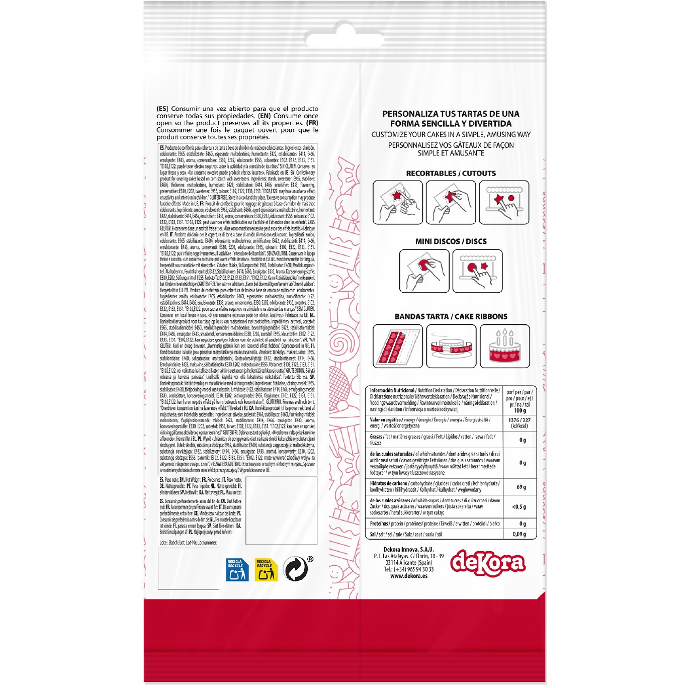 Ingrediënten: zetmeel, aroma, vochtinbrenger (E422), emulgatoren (E433), stabilisatoren (E414, E460i, E466), conserveermiddelen (E202, E330), zoetstoffen (E955, E965), verdikkingsmiddel (maltodextrine), kleurstoffen (E102, E122, E133, E151).