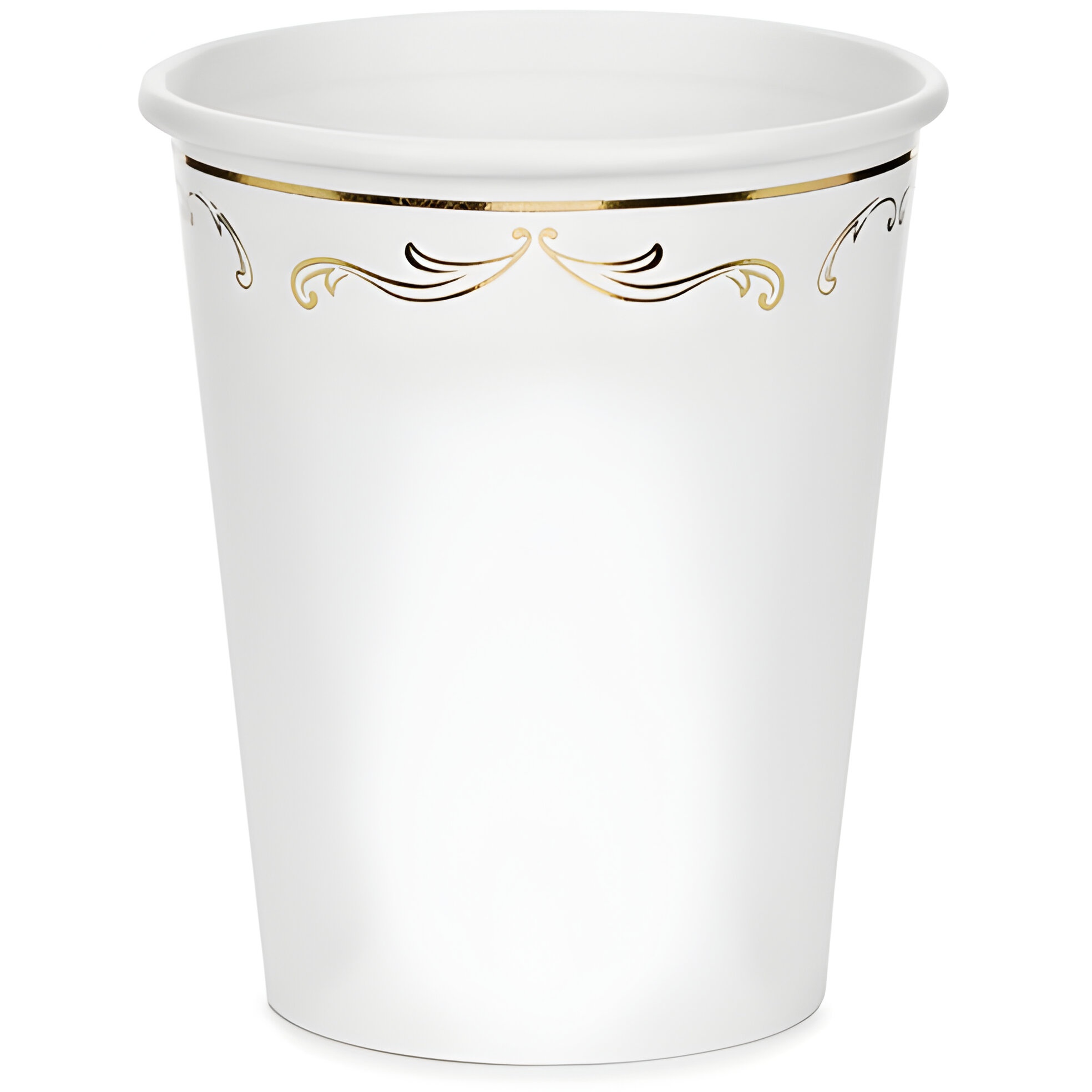 Witte papieren bekers met een subtiele gouden versiering die elke viering een chique accent geven. Hoogte ca. 9 cm en inhoud ca. 220 ml (7,4 oz). Wegwerpproduct, ontworpen voor koude dranken.