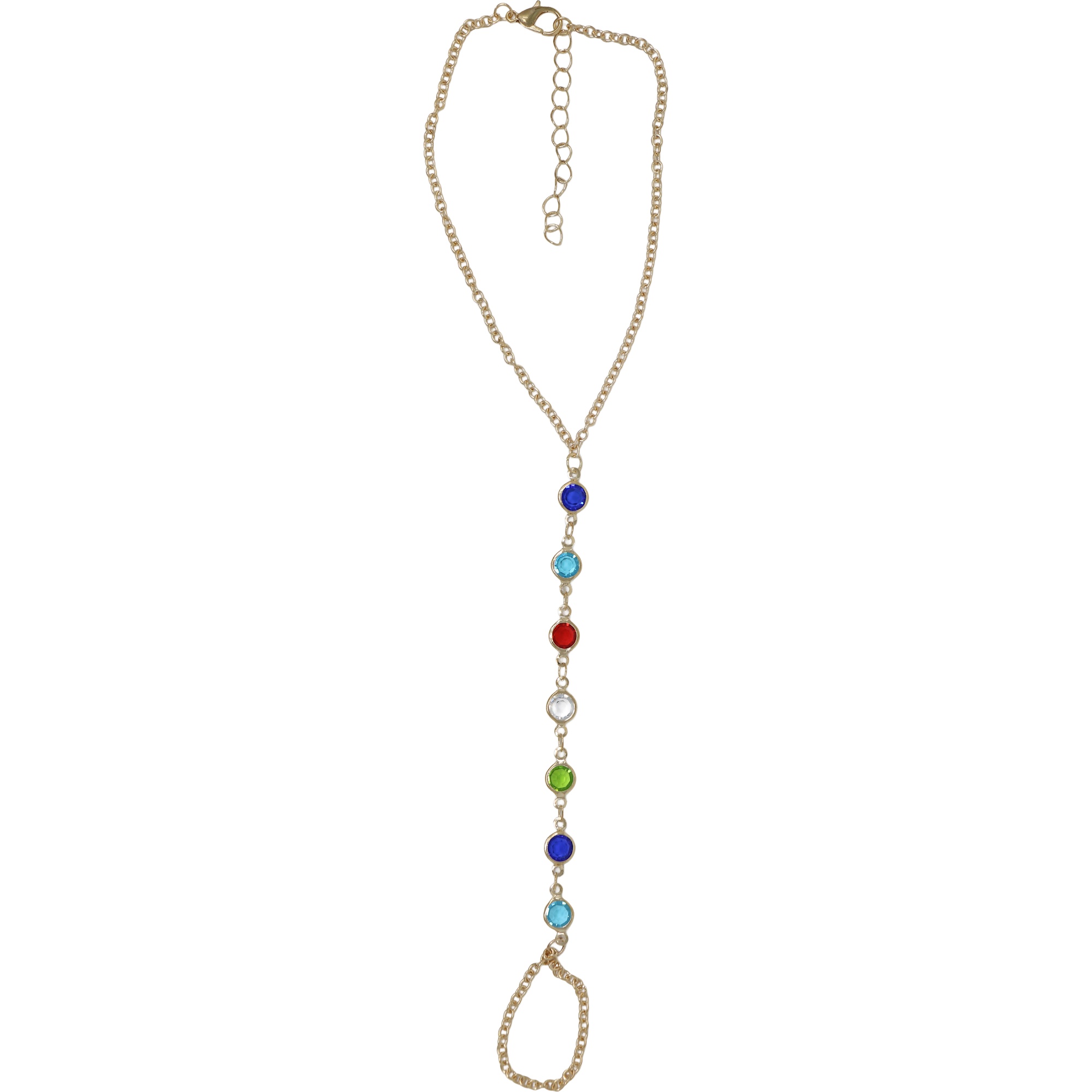 Boho enkelbandje met ring en gekleurde stenen. Delicaat ontwerp waarin een kettinkje naar een teenring loopt, met gekleurde stenen die een zomerse, vrolijke touch geven. Het sieraad combineert goudkleurig metaal en PVC-details voor een levendige glans en draagbaarheid bij casual gebruik. Voorzien van verstelbare sluiting en licht van gewicht - ideaal om met sandalen of op blote voeten te dragen op het strand en tijdens festivals.