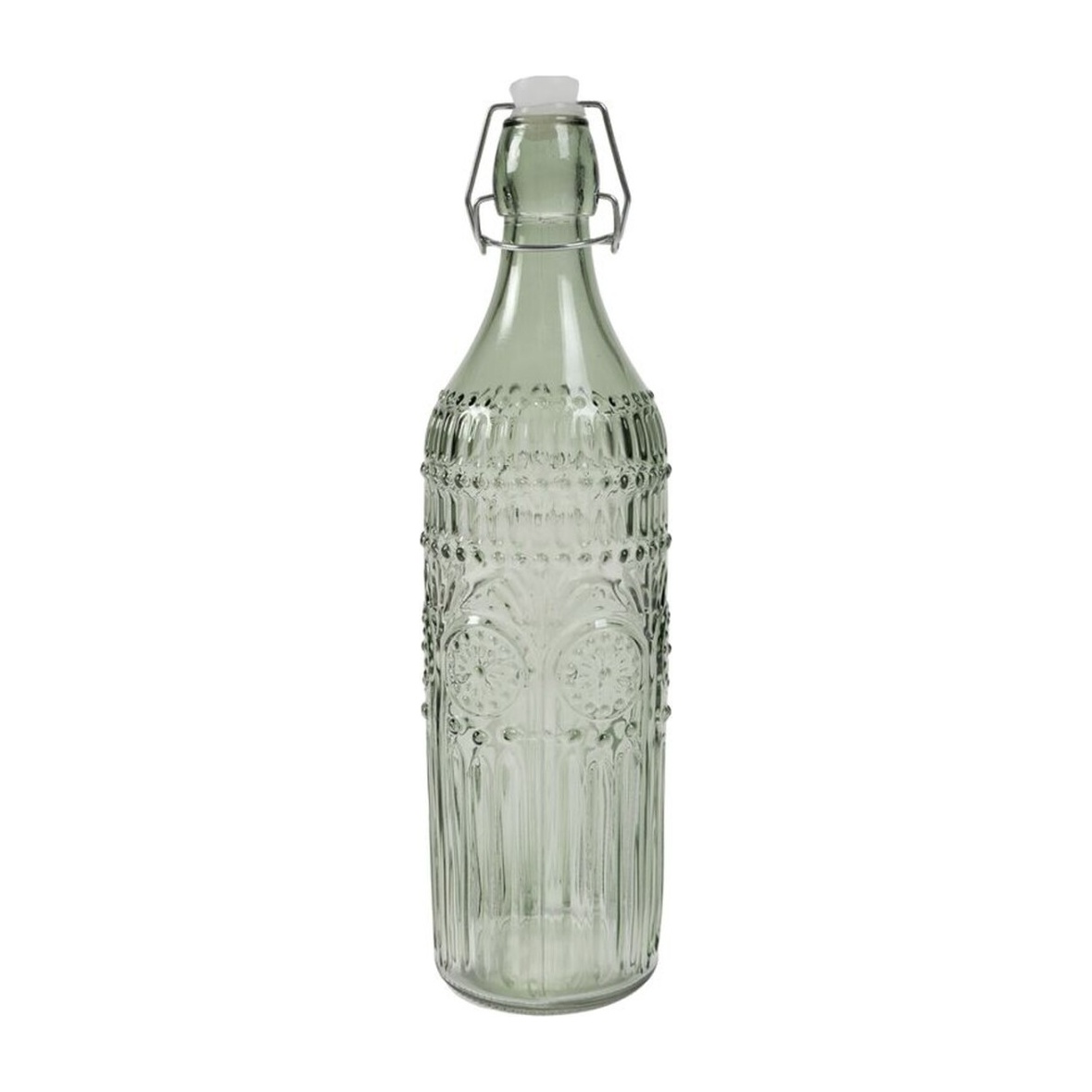 Elegante herbruikbare fles met een subtiel watergroen reliëf dat elke tafel een vleugje vintage geeft. Dankzij de luchtdichte beugelstop neem je hem zonder morsen mee; perfect voor water, sappen en andere koude dranken. Functioneel en decoratief tegelijk - een stijlvolle, duurzame keuze om minder wegwerpverpakkingen te gebruiken.