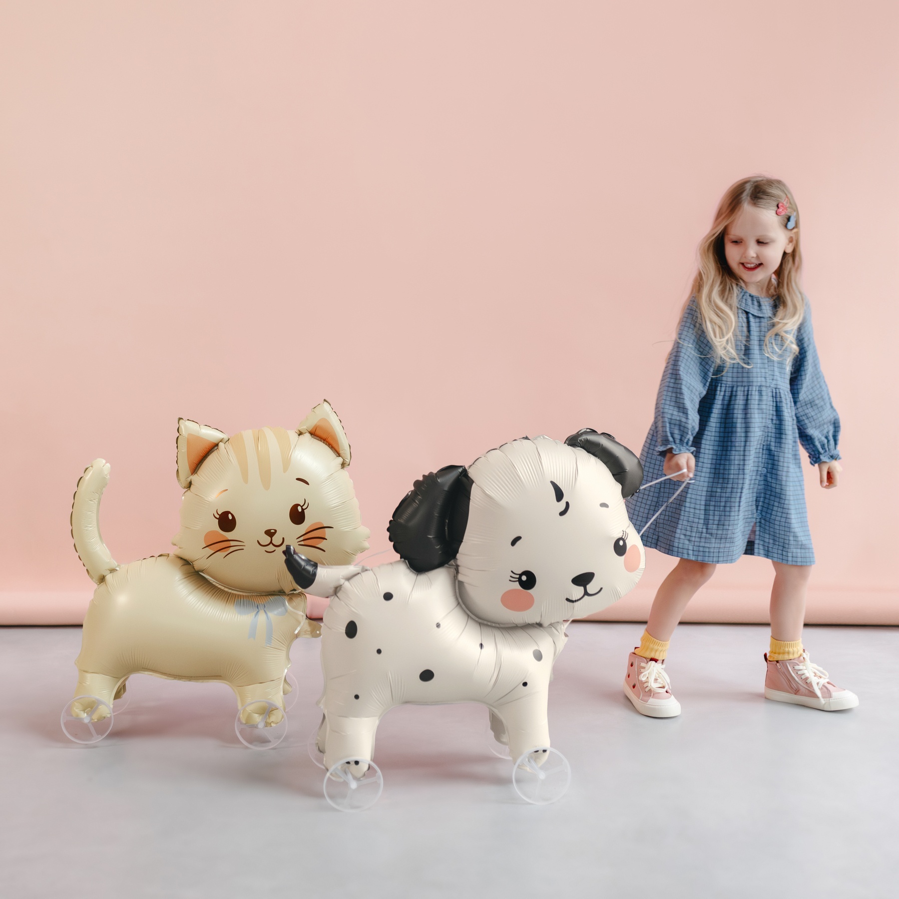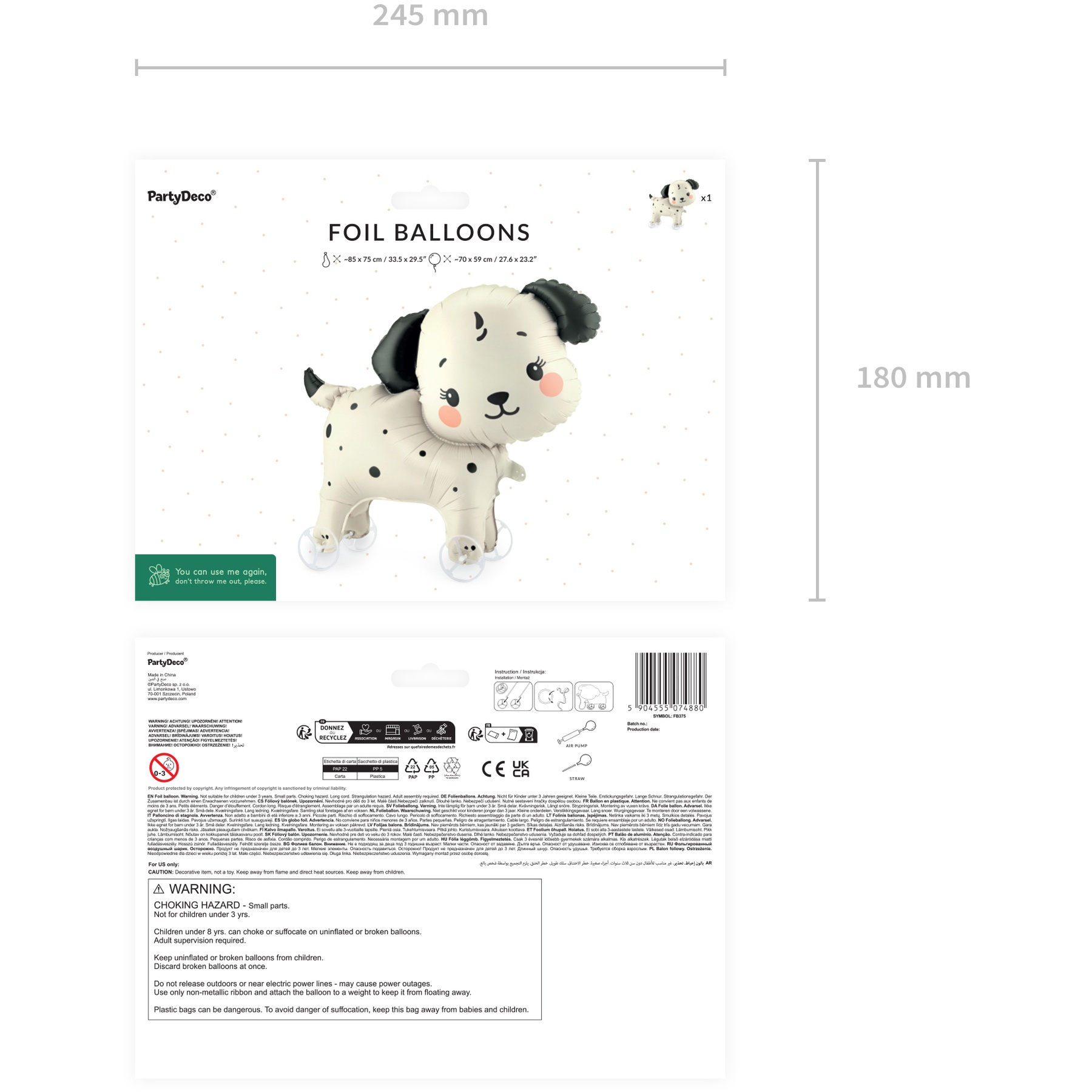 Folieballon in hondenvorm met wieltjes in beige en zwart. Opgeblazen heeft hij een afmeting van ongeveer 70 x 59 cm, wat zorgt voor een groot en opvallend decoratief detail. Voor het opblazen meet de ballon ongeveer 85 x 75 cm. De ballon wordt uitsluitend met lucht gevuld, wat het opzetten en tentoonstellen vergemakkelijkt. Dankzij de wieltjes rolt hij soepel over gladde ondergronden en zorgt zo voor beweging en speelsheid. Lief en modern ontwerp, ideaal voor kinderdecoraties en feestelijke settingen.