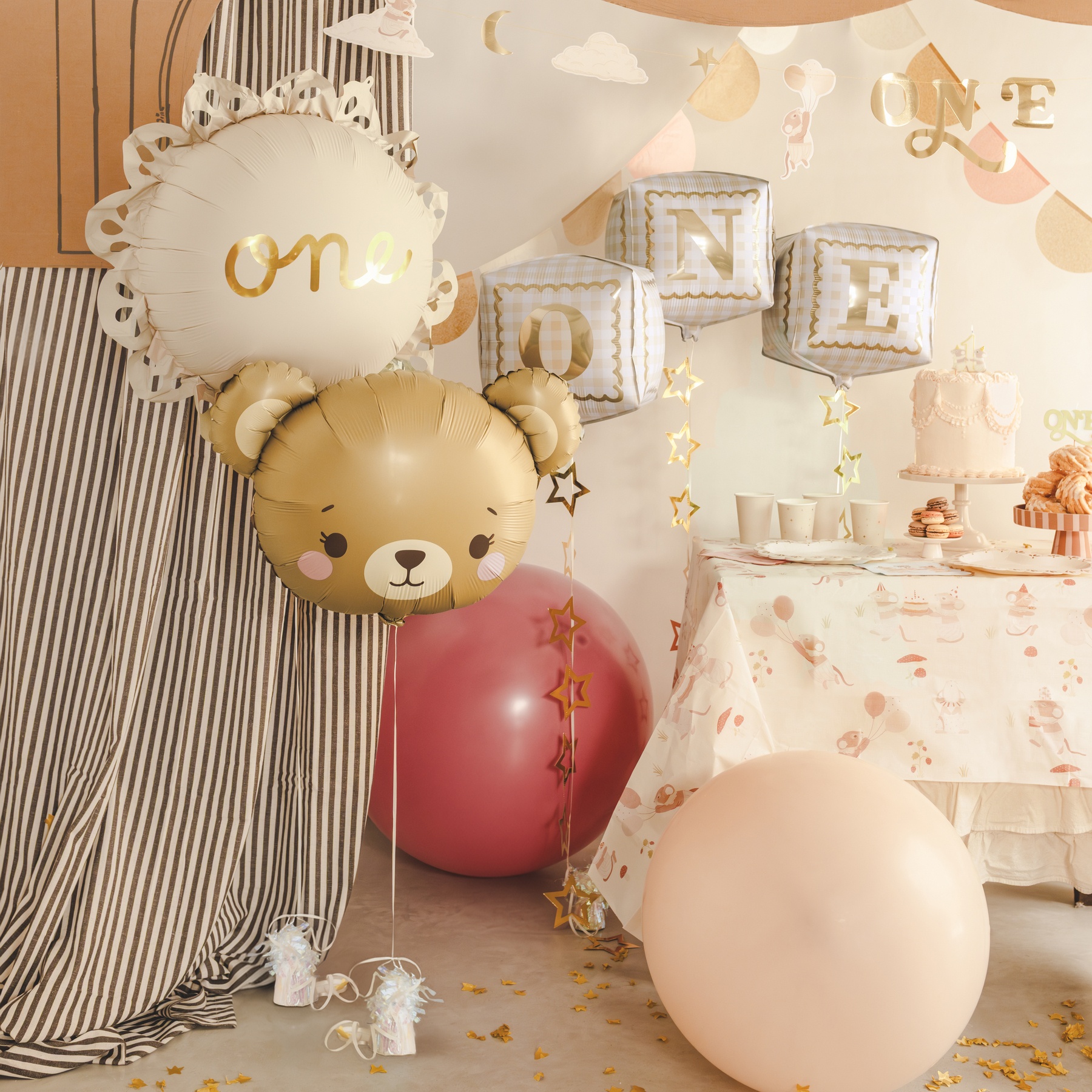 Folieballon in berenvorm in beige- en bruintinten, ontworpen om een zoet accent te geven aan kindervieringen. Afmeting vóór opblazen ca. 73,5 x 52 cm; na opblazen ca. 56 x 40 cm. Geschikt voor opblazen met zowel lucht als helium, waardoor je hem op tafels, in ballonboeketten of bij fotomomenten kunt plaatsen. De glanzende afwerking en het vriendelijke ontwerp zorgen voor een warme en elegante sfeer bij babyshowers en kinderfeestjes. Inclusief rietje om het opblazen te vergemakkelijken.
