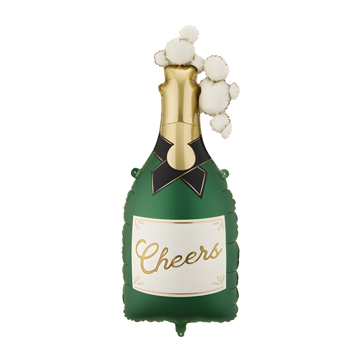 Folieballon in realistische champagneflesvorm in donkergroen met de opdruk Cheers en bubbeldetails die een feestelijk en verfijnd accent geven.