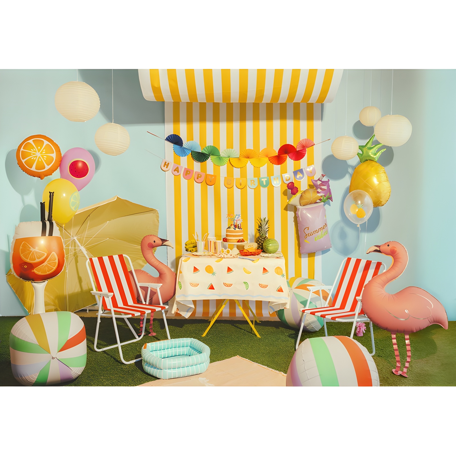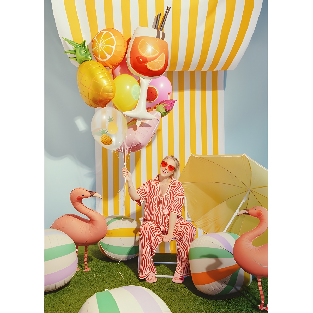 Folieballon in de vorm van een cocktailglas met zomers ontwerp in oranje en zwart en print van sinaasappelpartjes. Geeft tafels, photocalls en barzones een vrolijke, visuele toets en creëert een ideale sfeer voor zomerse feestjes.