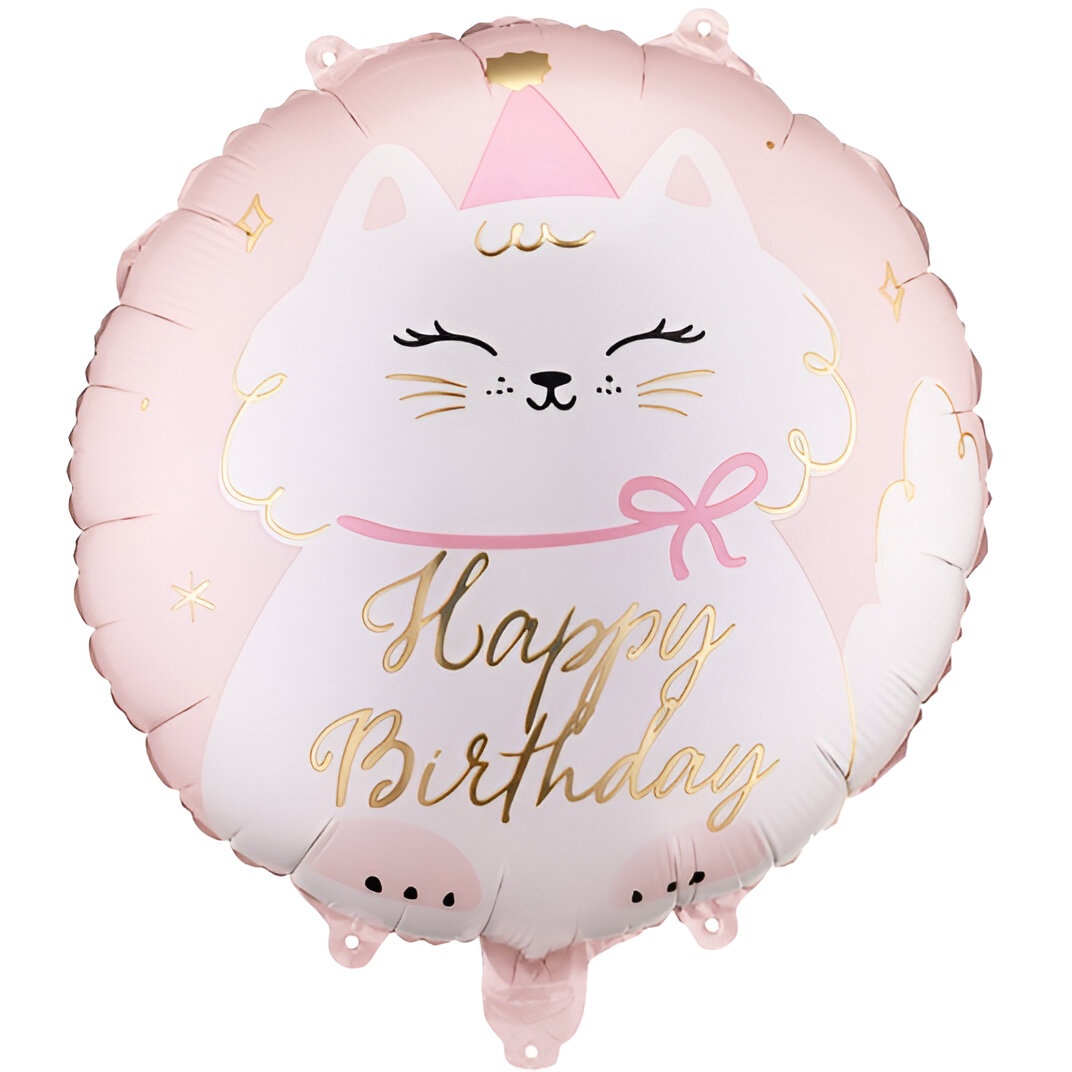 Folieballon in schijfvorm met een lief kattenontwerp en de tekst "Happy Birthday" in gouden details. Gemengde zachte kleuren, speciaal ontworpen voor kinderfeestjes.