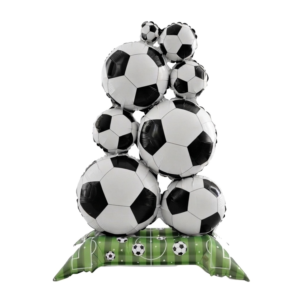 Folieballon voetbalveld met stapel voetballen en basis, 98 x 56 cm