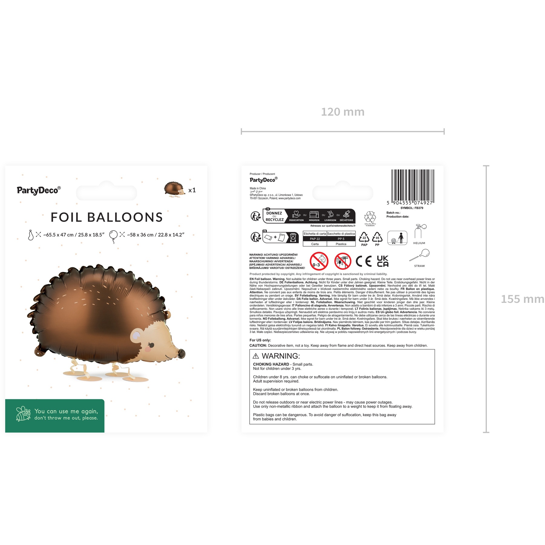 Folieballon in de vorm van een wandelende egel in warme bruintinten, met een vriendelijk en opvallend uiterlijk om kinderfeesten en verjaardagen te versieren. Afmetingen vóór opblazen ca. 65,5 x 47 cm; na opblazen ca. 58 x 36 cm. De pootjes zijn ongeveer 10 cm hoog, waardoor de ballon op vlakke ondergronden lijkt te lopen. Ontworpen voor heliumvulling en ideaal om een leuk, fotogeniek accent aan je decoratie toe te voegen.