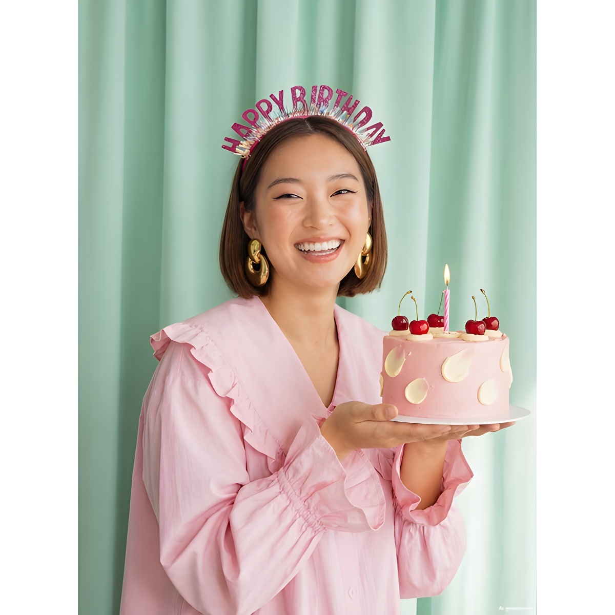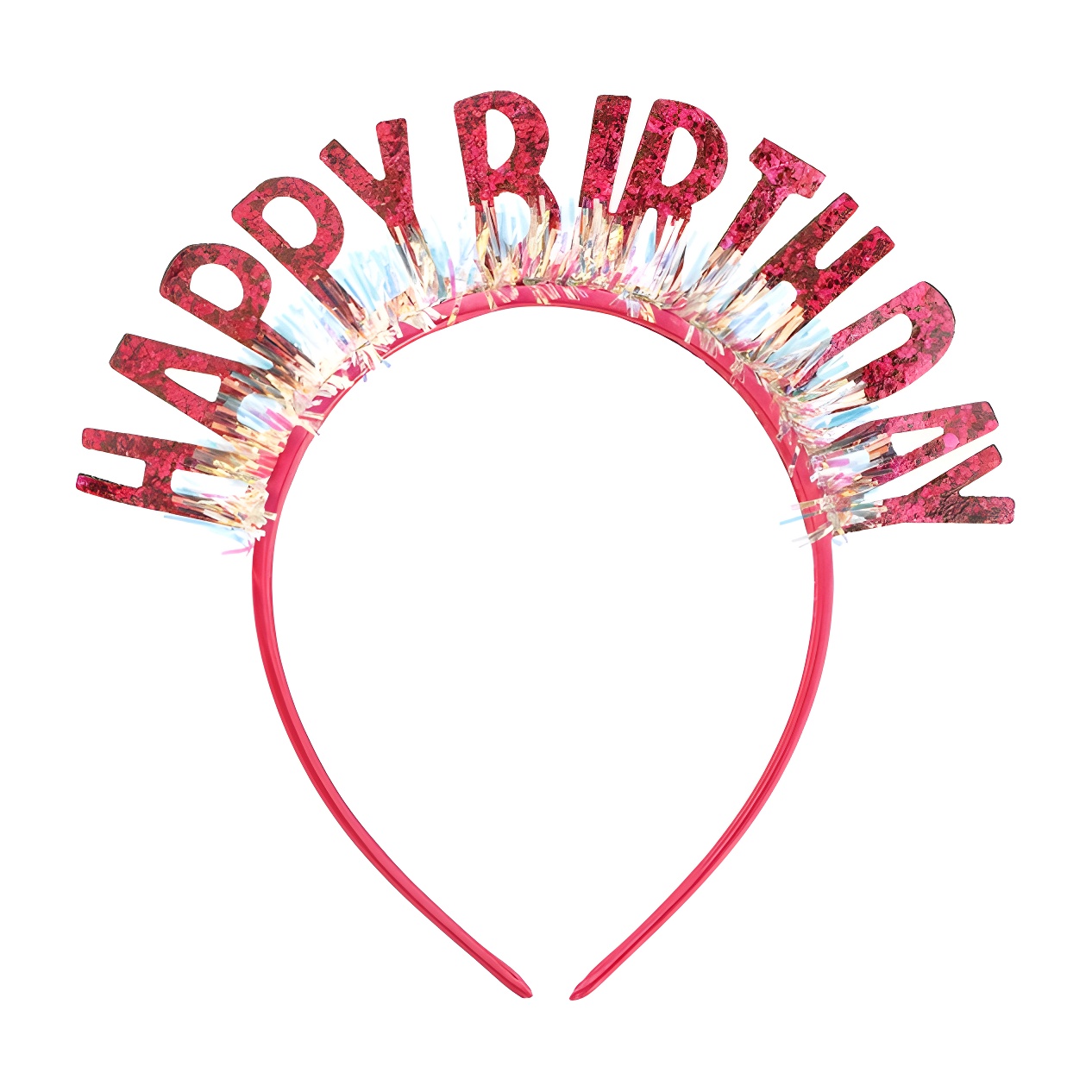 Feestelijke "Happy Birthday" haarband in fuchsia met glitterletters voor extra glans tijdens kinderfeestjes. De holografische kwastjes geven kleur en dynamiek. Met compacte afmetingen van 18 x 18 cm, ideaal voor meisjes op verjaardagen. Licht en comfortabel ontwerp dat foto's verbetert en elk feest vrolijker maakt.