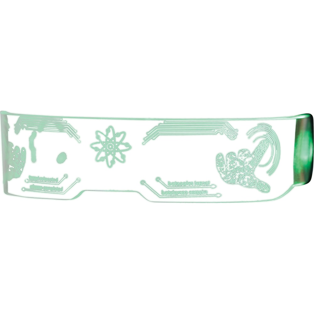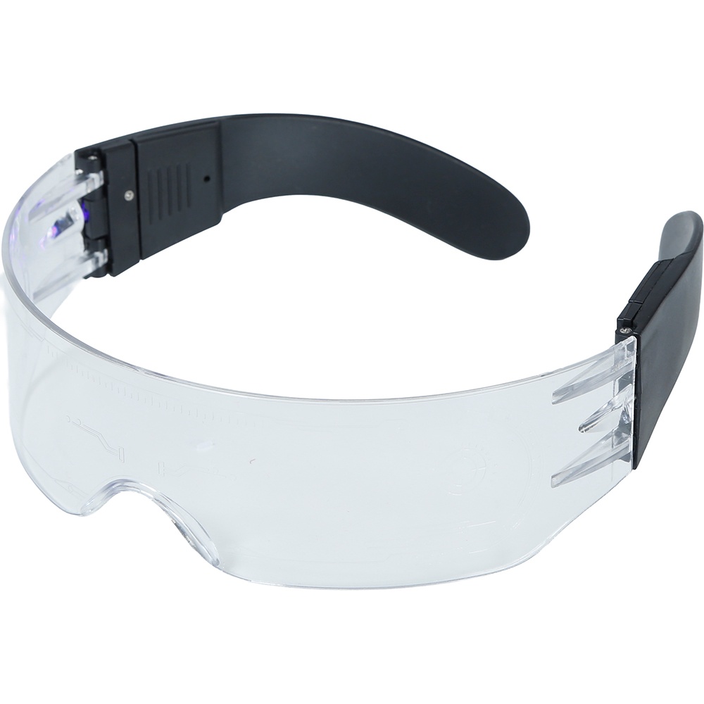 Retrofuturistische bril met multicolor LED-verlichting, ontworpen om op te vallen op festivals, raves en nachtfeesten.