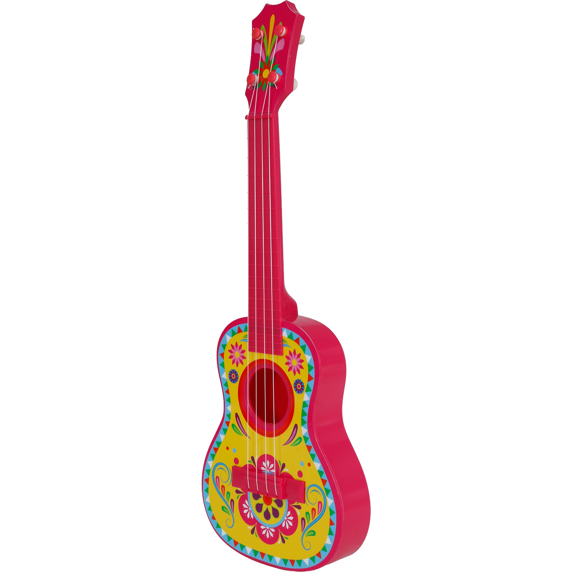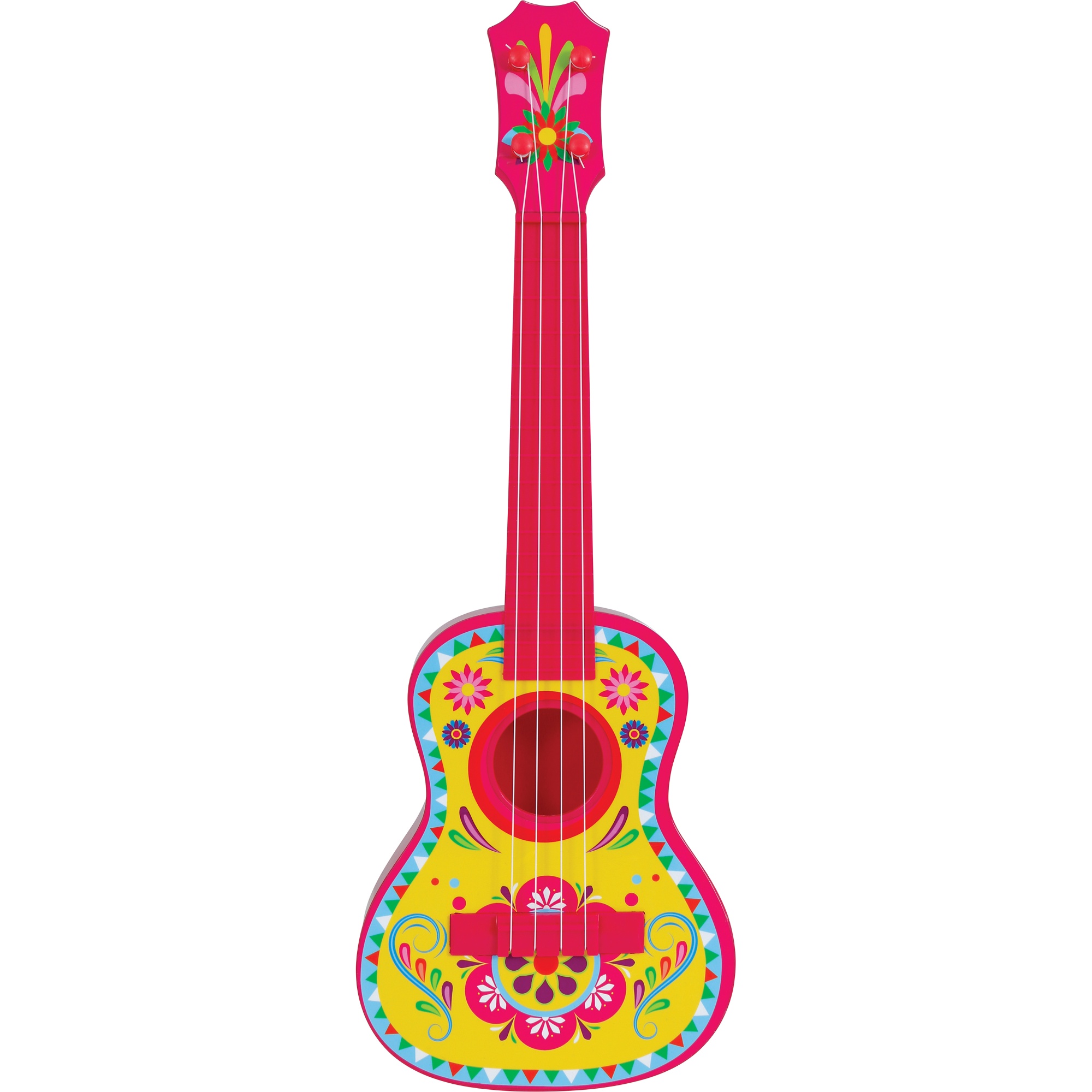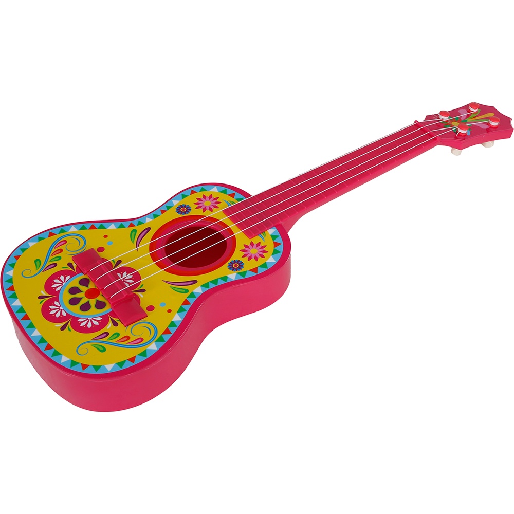 Kleurrijke Mexicaanse gitaar van 54 cm, ontworpen als kostuumaccessoire en feestattribuut. Gemaakt van licht PVC en met een traditioneel ontwerp afgewerkt met opvallende bloemdetails. Ideaal voor carnaval, fotobooths, optredens en animatie; geeft elke outfit een feestelijke en authentieke touch. Dankzij het compacte formaat is hij prettig te bespelen en te hanteren door zowel volwassenen als kinderen.