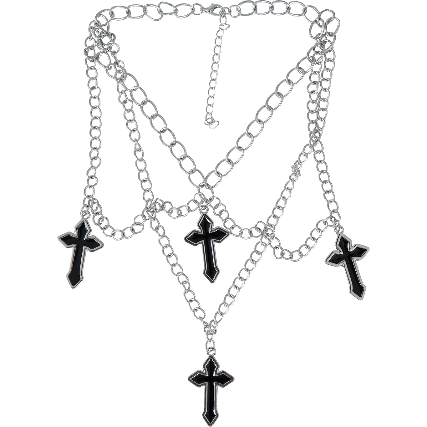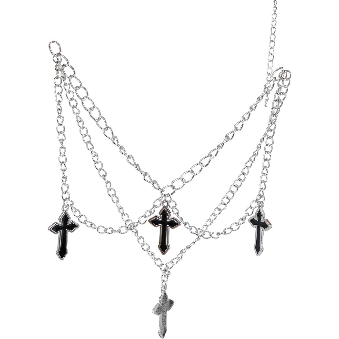 Gelaagde ketting met vier kruisen in een urban streetwear-look. Geeft een gedurfde, moderne touch aan casual en streetwear-geïnspireerde outfits. De vier hangende kruisen zijn verdeeld over meerdere kettingen voor een hedendaags gelaagd effect. Voorzien van een verstelbare sluiting zodat je de lengte naar eigen stijl kunt afstemmen. Metalen uitvoering met donkere contrastdetails op de kruisen voor een opvallende en stevige afwerking.