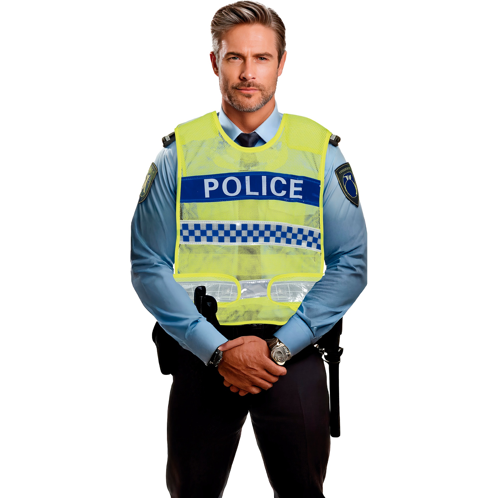 - Realistische uitstraling met de opdruk "POLICE" en geblokte strepen die officiële hesjes nabootsen.