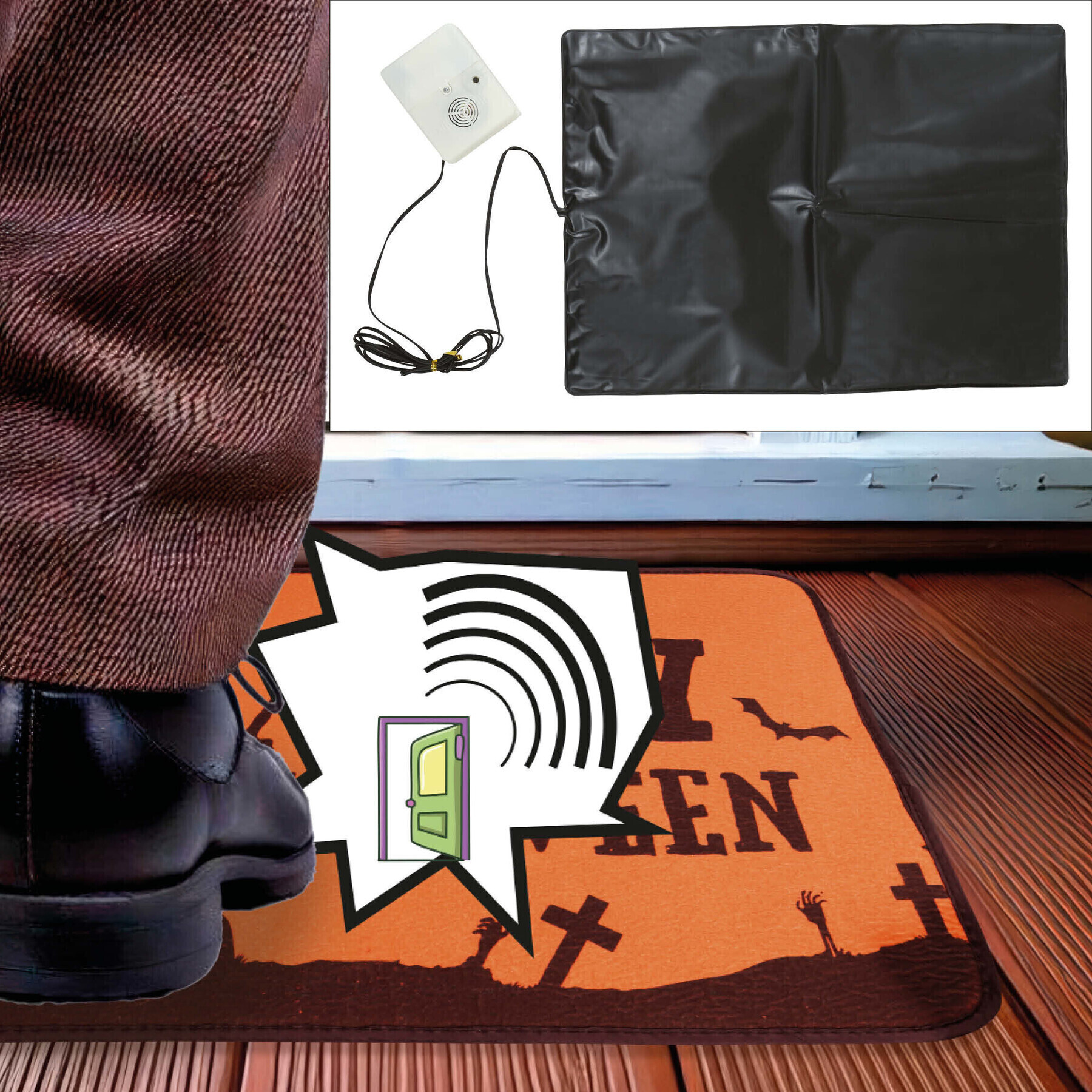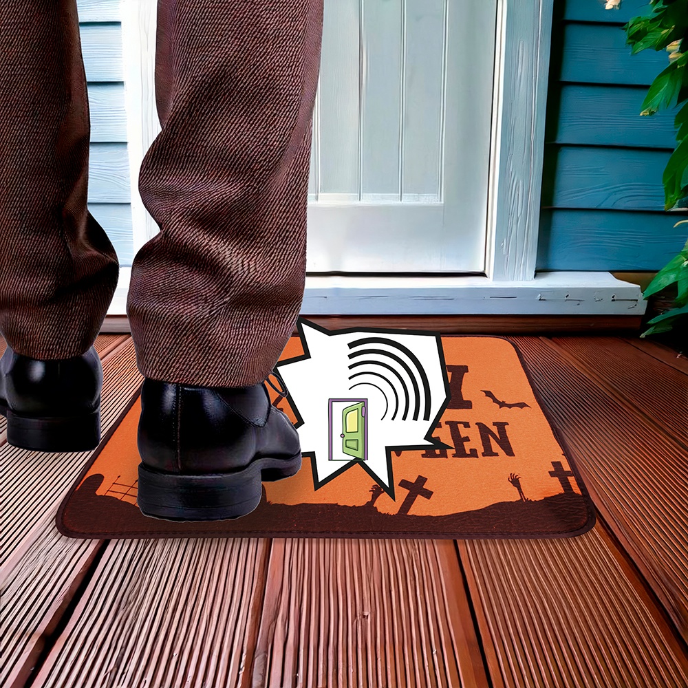 - Wordt onder de deurmat geplaatst met een sensor die een Halloween-geluid afspeelt wanneer erop gestapt wordt.