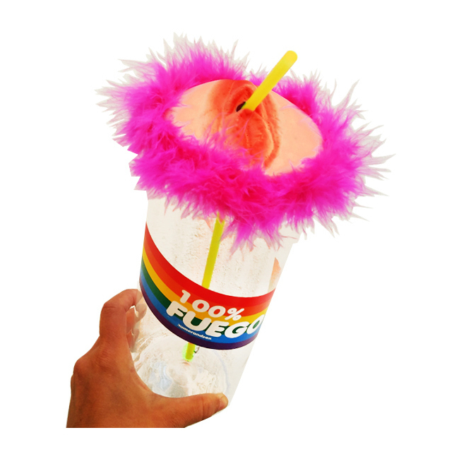 Deze fles bestaat uit een doorzichtige fles met een roze rietje aan de bovenkant en een versiering van een vagina op een harig roze gebied.