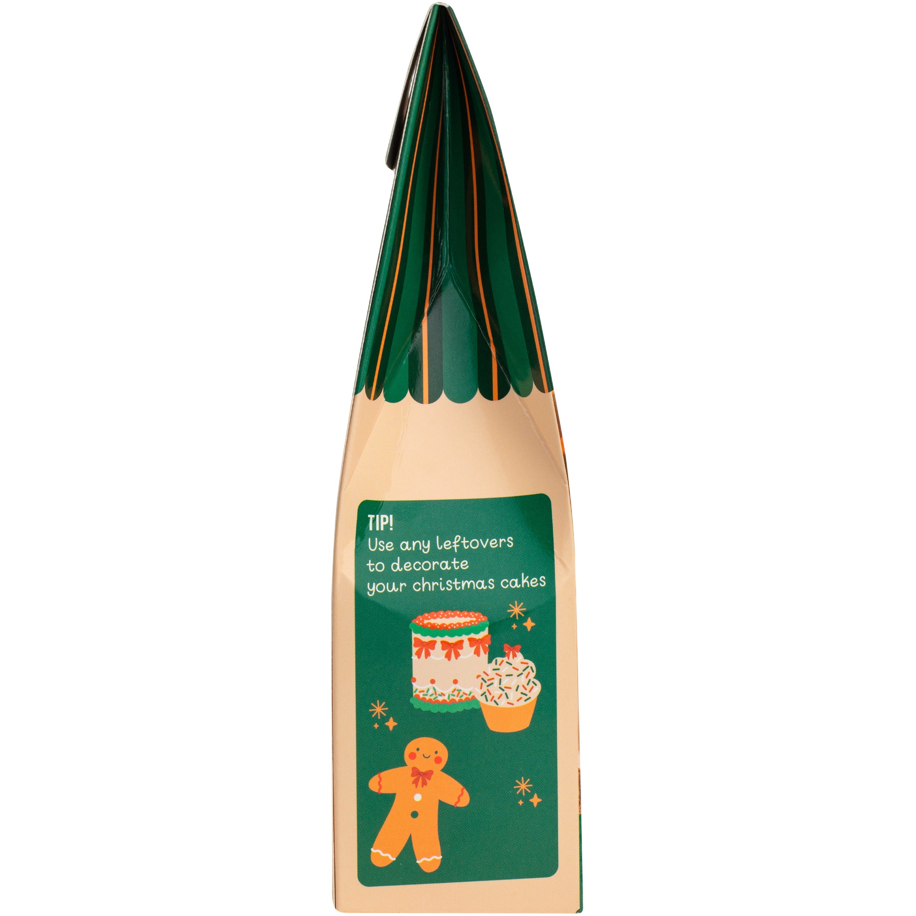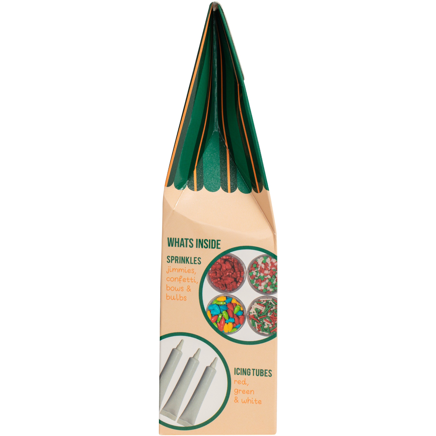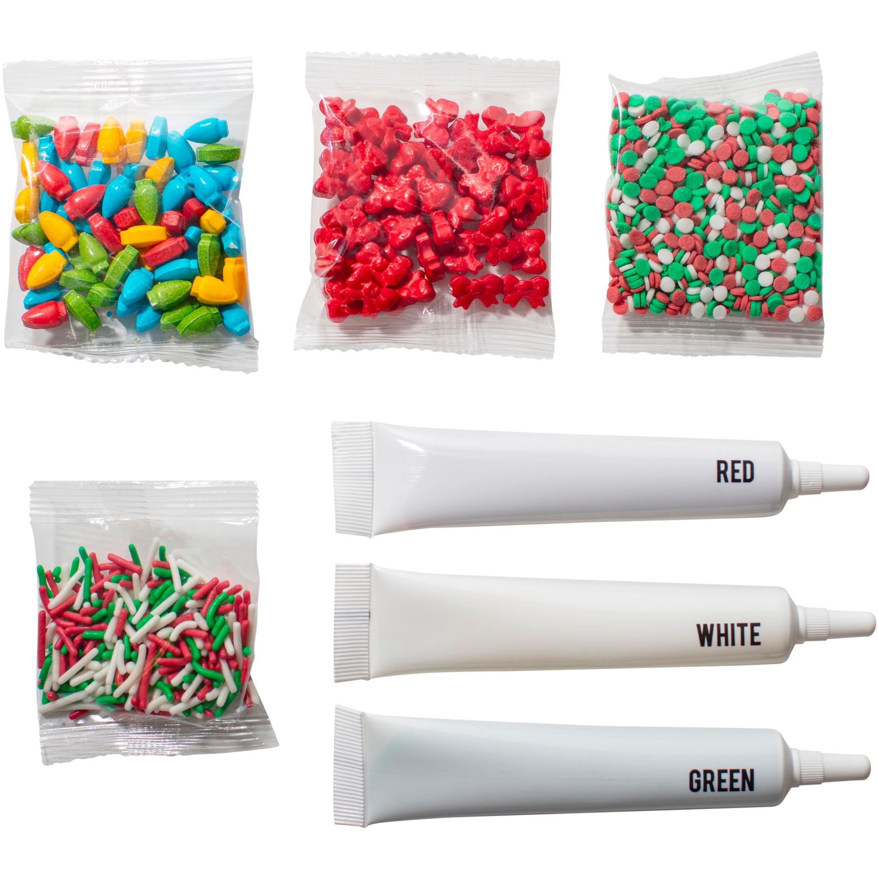 - Inclusief: 3 tubes met gekleurde icing (wit, groen en rood) en 4 zakjes met strooisels (rode strikjes, kerstlichtjes, snoepstaafjes en confetti in wit, groen en rood).