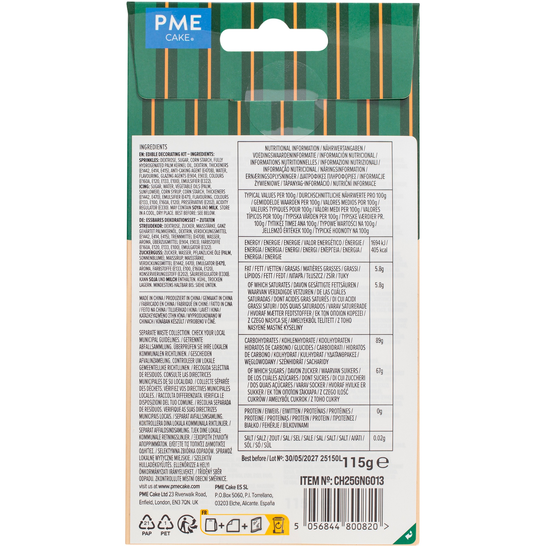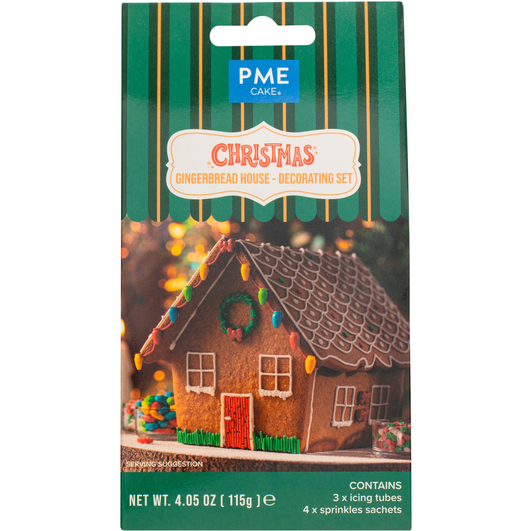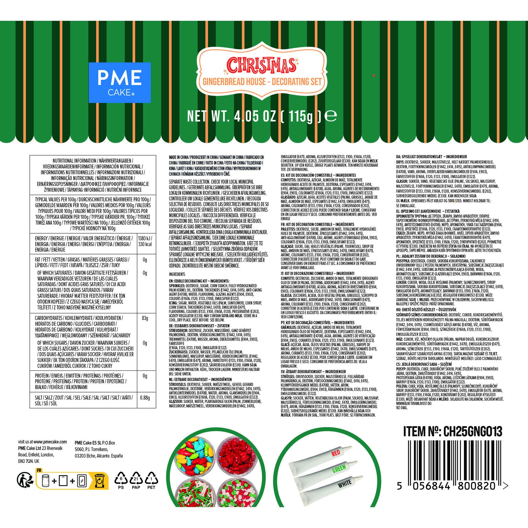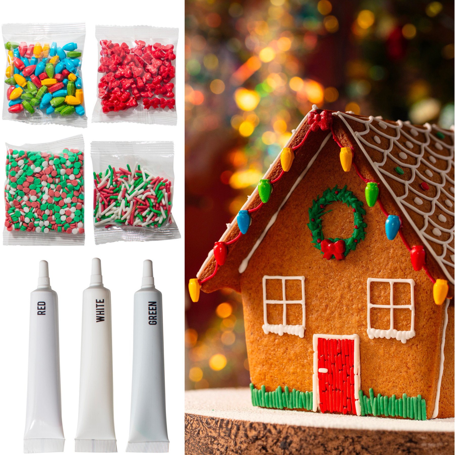 - Inclusief: 3 tubes met gekleurde icing (wit, groen en rood) en 4 zakjes met strooisels (rode strikjes, kerstlichtjes, snoepstaafjes en confetti in wit, groen en rood).