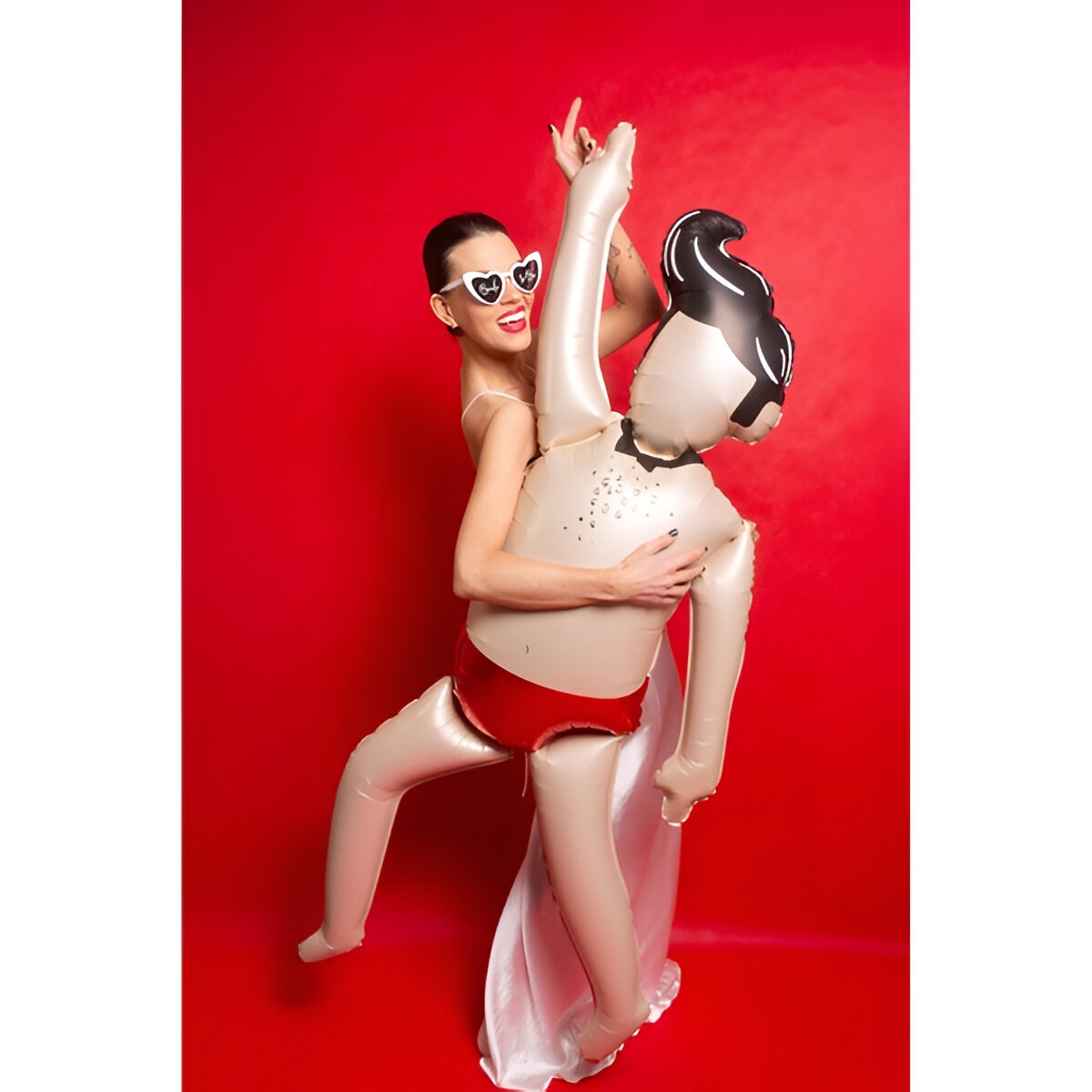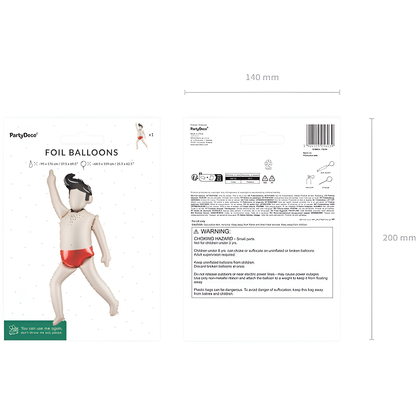 Gigantische folieballon in de vorm van een man in crème- en roodtinten, met zwart haar en speelse details. Voor het opblazen is hij ongeveer 95 x 176 cm; eenmaal opgeblazen is hij ongeveer 64.5 x 159 cm. Kan met lucht of helium worden gevuld om hem aan verschillende opstellingen en decoraties aan te passen. Voegt een opvallend en fotogeniek element toe aan photocalls, verjaardagen en andere vieringen, en creëert zo een originele en speelse sfeer. Licht ontwerp dat plaatsing vergemakkelijkt en zich makkelijk combineert met andere feestdecoratie.