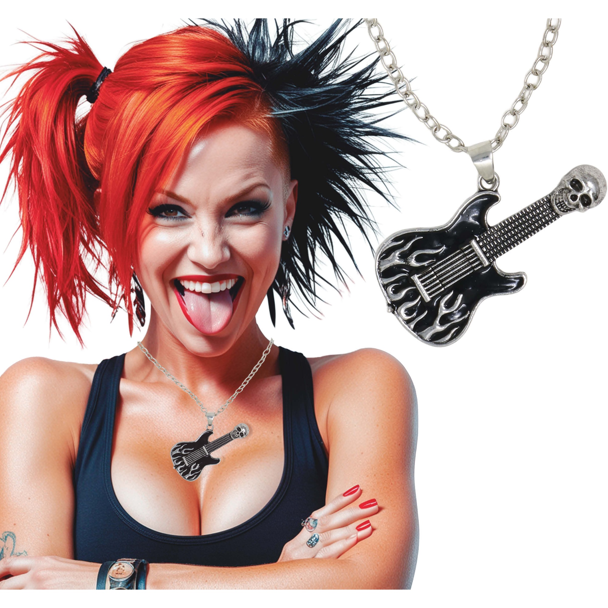 Halsketting met elektrische gitaar in rock-punkstijl: hanger met vlammen en een schedeldetail op de kop voor een rebelse, opvallende look. Gemaakt van metaal met een zilverfinish voor een krachtige esthetiek die goed aansluit bij alternatieve stijlen. Perfect voor concerten, themafeesten of om je dagelijkse rock/punk-outfit compleet te maken. Unisex ontwerp voor wie een persoonlijk, muzikaal accessoire zoekt.