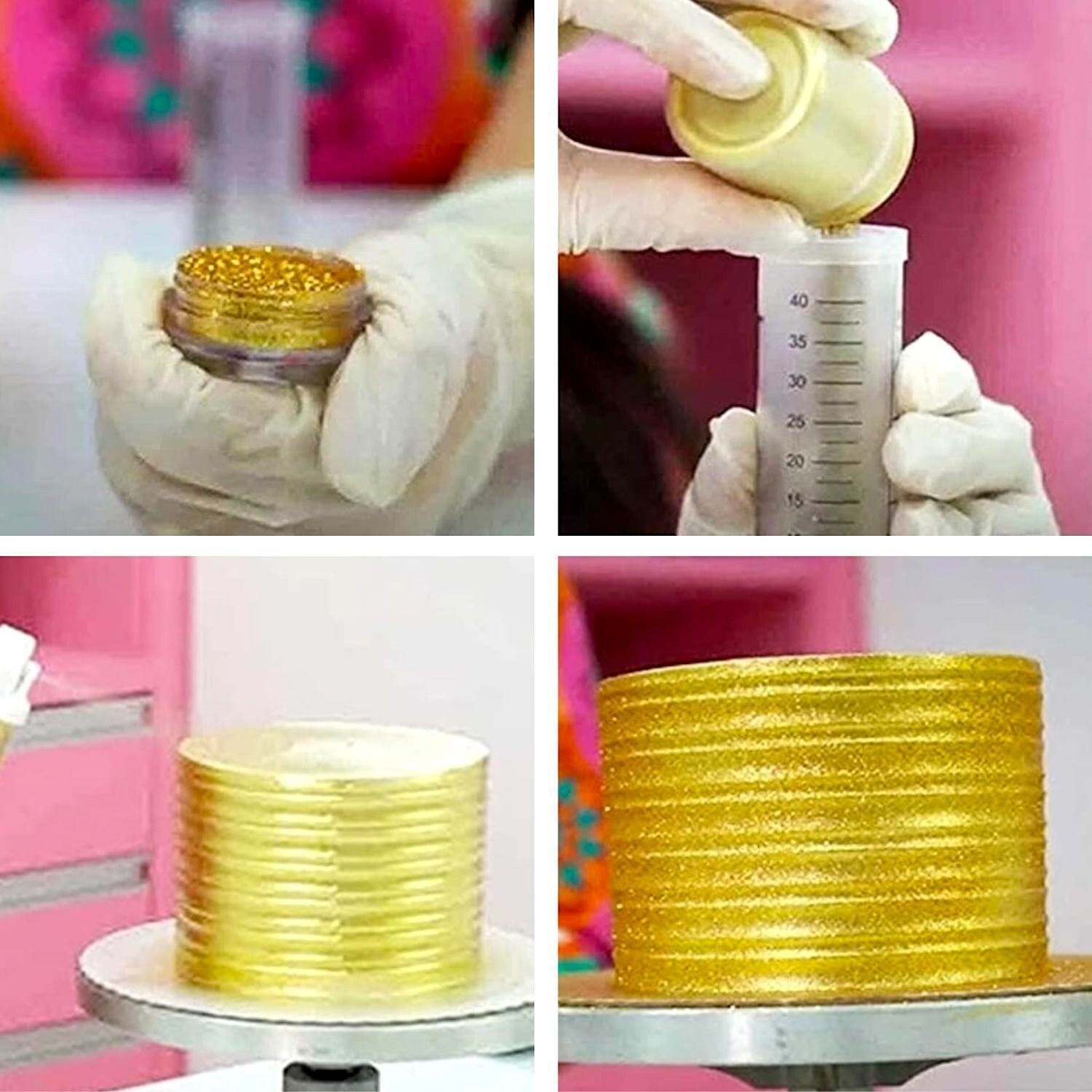 - Bij het gebruik van poederkleurstoffen of glitters, kunnen we het product direct droog gebruiken (het moet van kleine deeltjes zijn zodat het gemakkelijk door de opening van de airbrush kan). We kunnen het poeder ook oplossen in voedselalcohol.