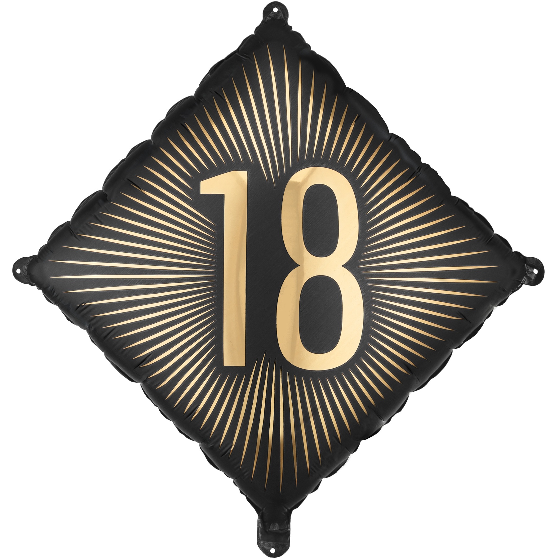 Metallic folieballon in zwart met het gouden cijfer "18" in het midden, bedoeld als opvallend element voor meerderjarigheidsvieringen. Ongeveer vóór opblazen: 54 x 54 cm (20 x 20"), na opblazen: 46 x 46 cm (18 x 18"). Kan met lucht of helium gevuld worden, afhankelijk van je decoratiewens. Inclusief opblaasrietje voor eenvoudig vullen.